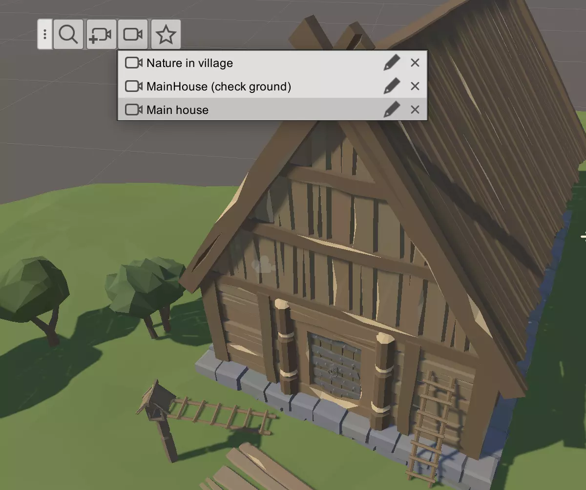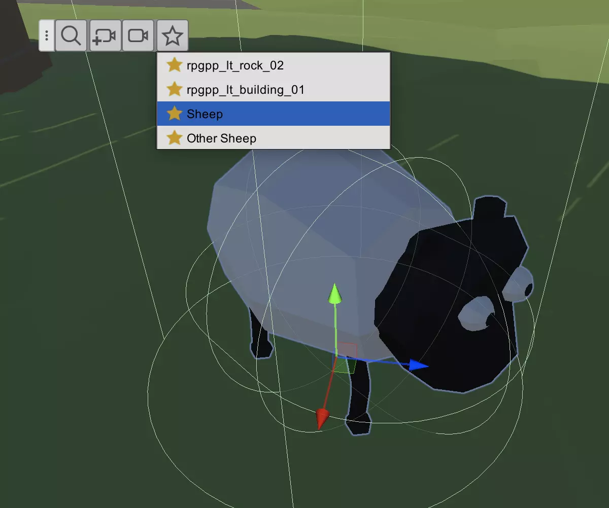 シーンビューの管理ツールバーは、複雑なシーンを移動するためのコンパスと言えるものです。シーンのアクティビティを効率的に管理するためのツールがいくつか提供されています。シーンで使用できるアセットのみを表示し、検索結果から直接シーンにアセットをドラッグできる検索ツールが備わっています。また、カメラの現在の位置をプリセットとして保存し、それにショートカットを割り当て、プリセット間を切り替えられるカメラアクションツールも備わっています。