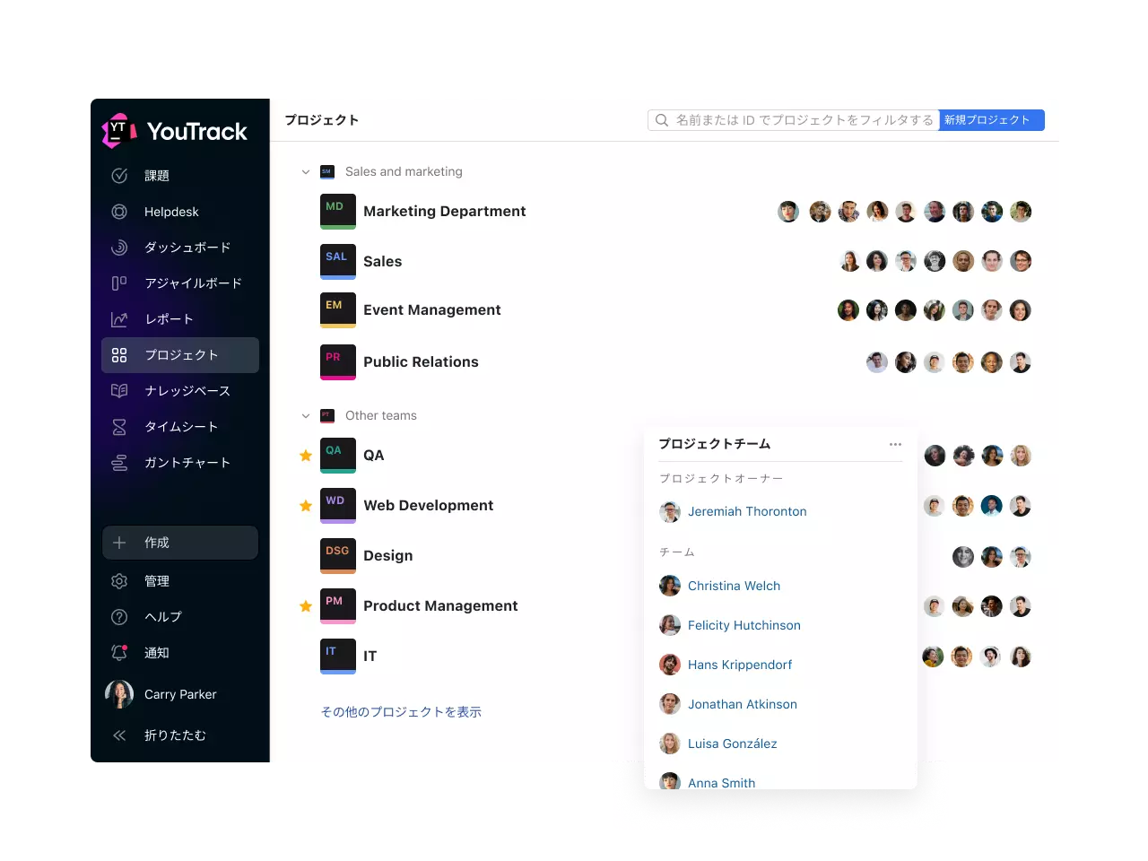 YouTrack はあらゆるチームプロジェクトの作業を効率化して生産性を高める機能が満載のプロジェクト管理ツールです。ソフトウェア開発・DevOps から人事・マーケティングまで、さまざまな部門のチームで YouTrack の機能を活用し、あらゆる規模のプロジェクトを簡単に追跡しながら共同作業を進めることができます。
