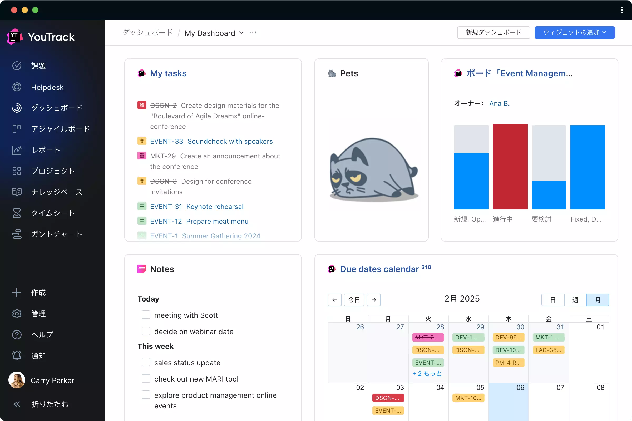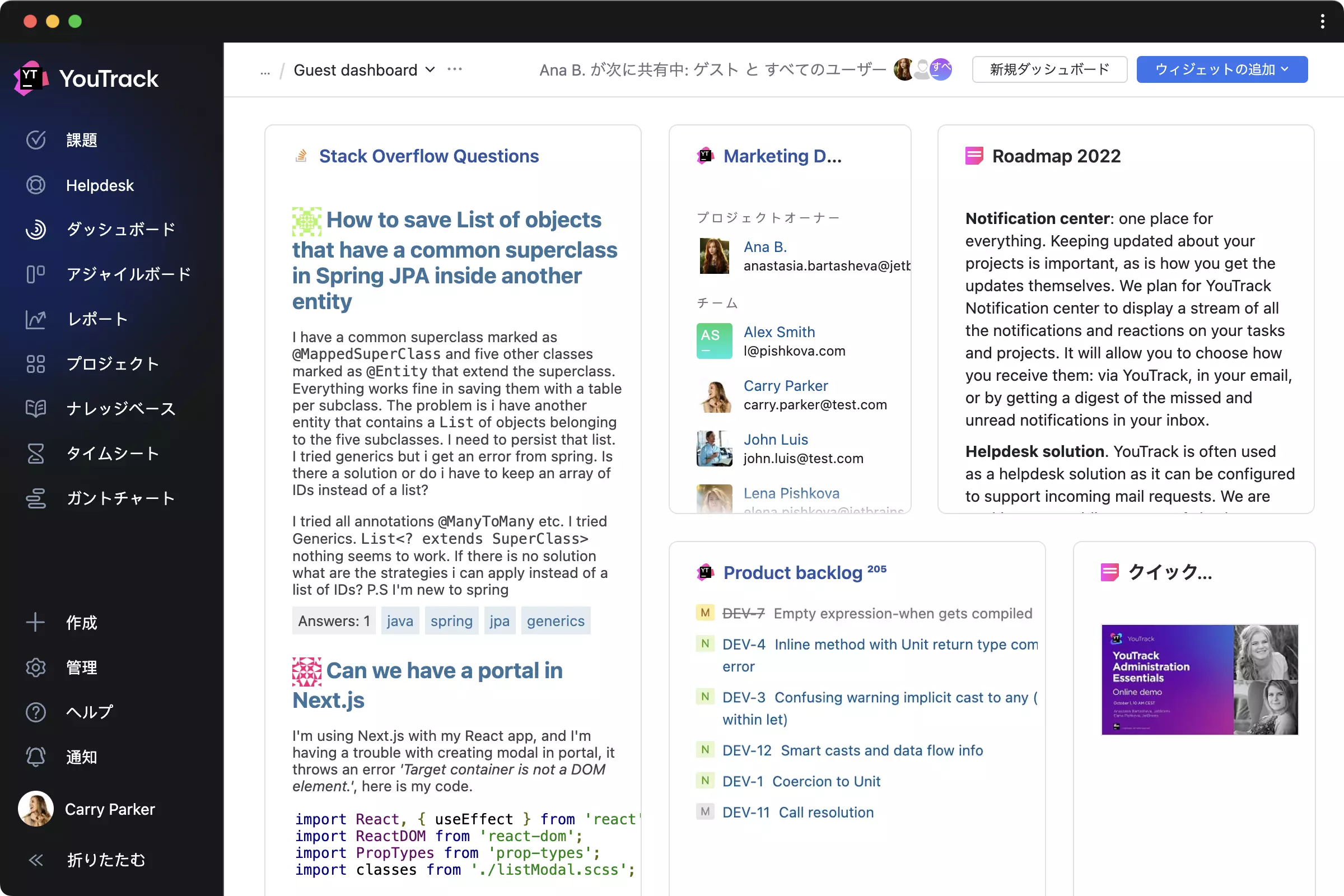 ダッシュボードでは、レポートやその他の有用な情報を 1 つのページにまとめることができます。 個人用やチーム用、または顧客のニーズに合わせて、ダッシュボードをいくつでも作成することができます。また、YouTrack ユーザーと共有したり、一般に公開することも可能です。