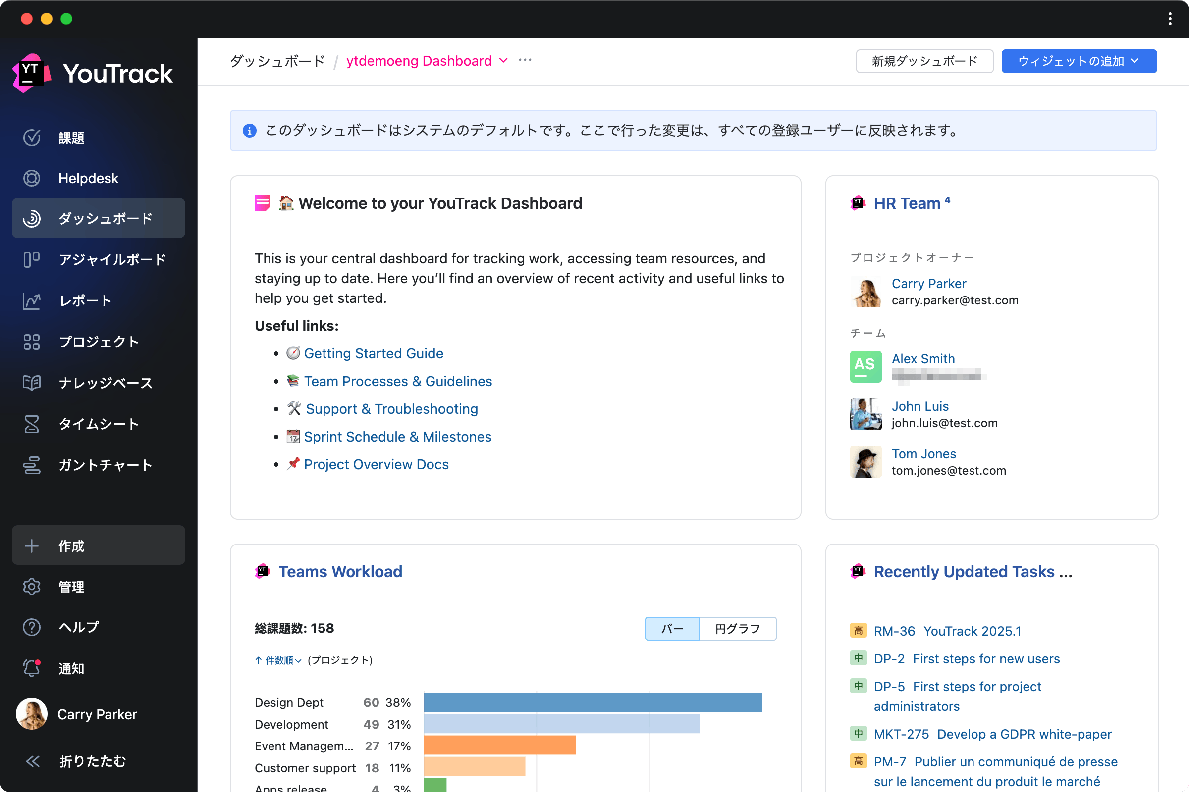プロジェクト管理者は 1 つのデフォルトダッシュボードをカスタマイズし、組織全体のメモ、レポート、およびその他の有益な情報をまとめて表示する場所にすることができます。