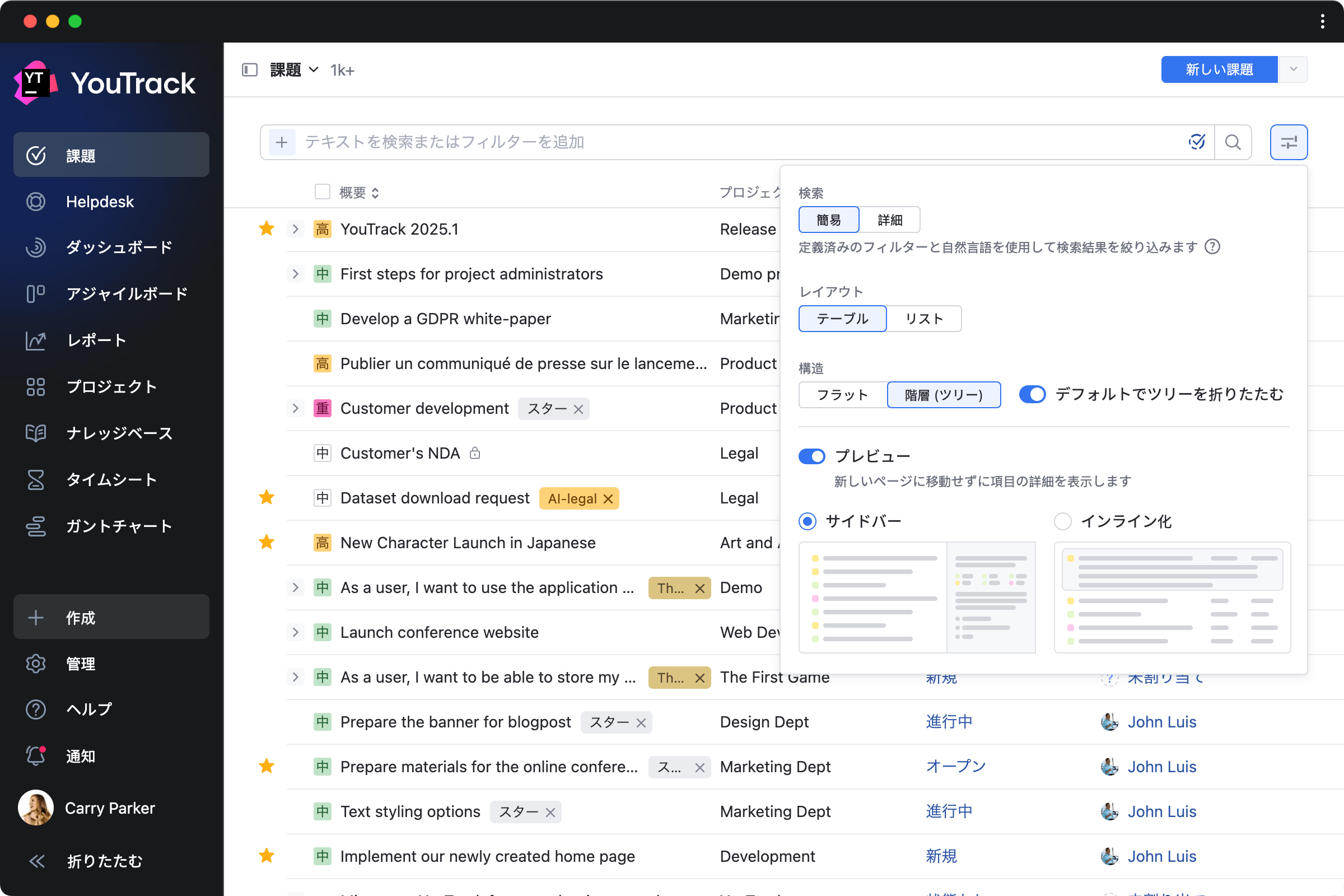 ワークスペースとタスクビューを整理する際には、多数のオプションを利用できます。 リストビューとテーブルビューを簡単に切り替え、それらを必要な情報でカスタマイズすることができます。 多くのフィールドは課題ビュー内で直接編集できるため、時間と手間を省くことができます。また、簡単にプレビューできるため、作業環境を切り替える回数を減らすことができます。 複数のフィールドで並べ替えとグループ化を行うことで、大規模なタスクリストを簡単に管理することができます。