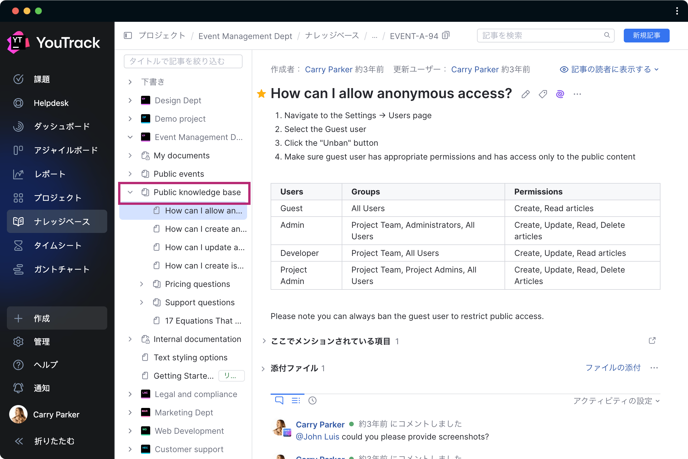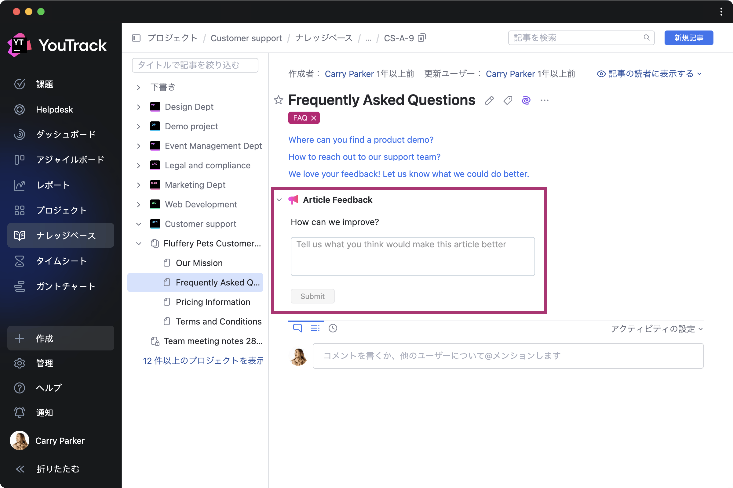 ナレッジベースの公開セクションを構成すると、訪問者と検索エンジンは YouTrack に登録しなくても製品に関する記事と FAQ を閲覧し、検索できるようになります。 強力なフィルター、タグ、および全文検索機能が用意されているため、顧客は探している項目を簡単に発見できます。また、記事のコメント機能は登録ユーザーが質問に対する回答を得るのに役立ちます。 フィードバックを収集する際に Article Feedback アプリを使用すると、顧客の考えを知ることができます。