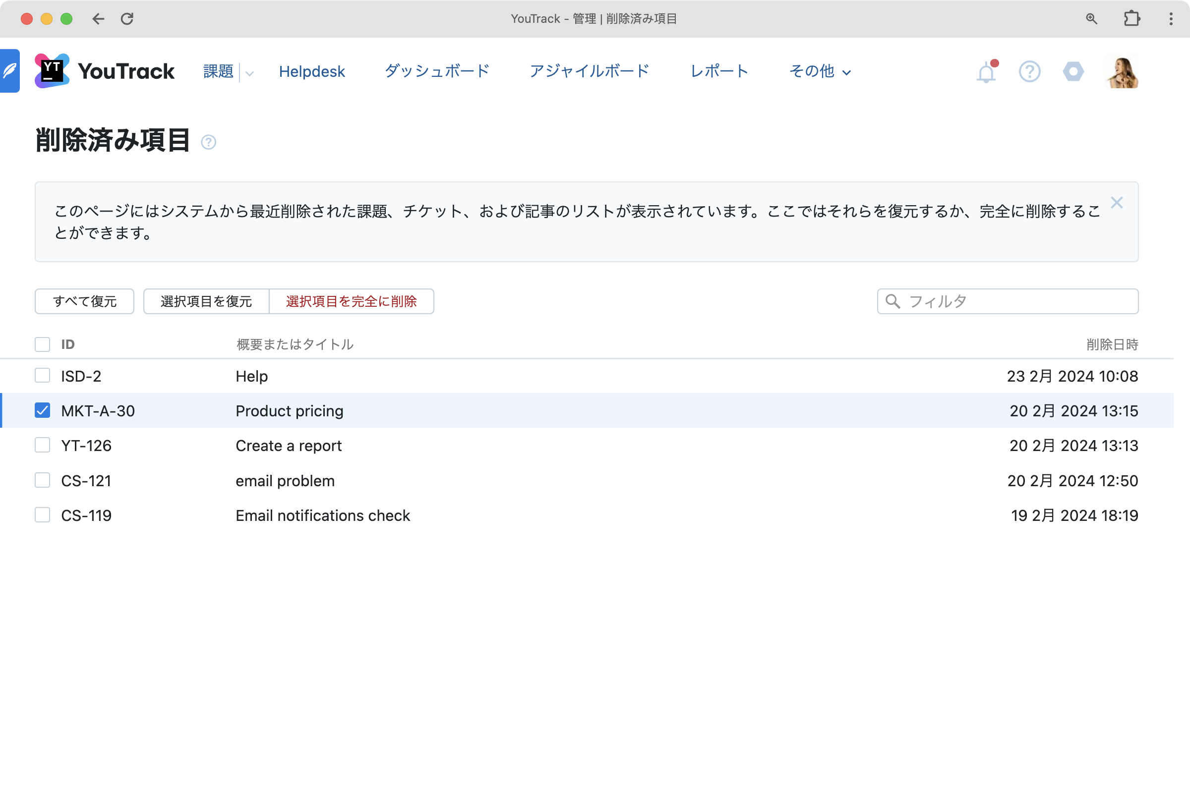 重要な課題、チケット、または記事が誤って削除される場合があります。 削除から 2 週間以内であれば、管理者がいつでもこのようなコンテンツを簡単に復元できるようになりました。 さらに、意図的に削除したコンテンツを完全に消去してストレージ容量を解放できるようになりました。 また、通知やアクティビティストリームを確認するだけで削除された項目や回復された項目を簡単に確認することができます。