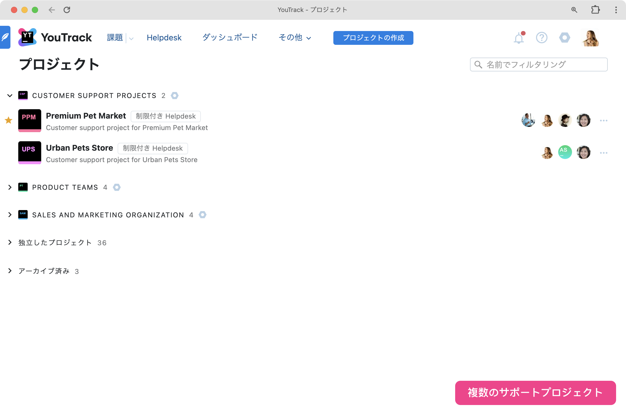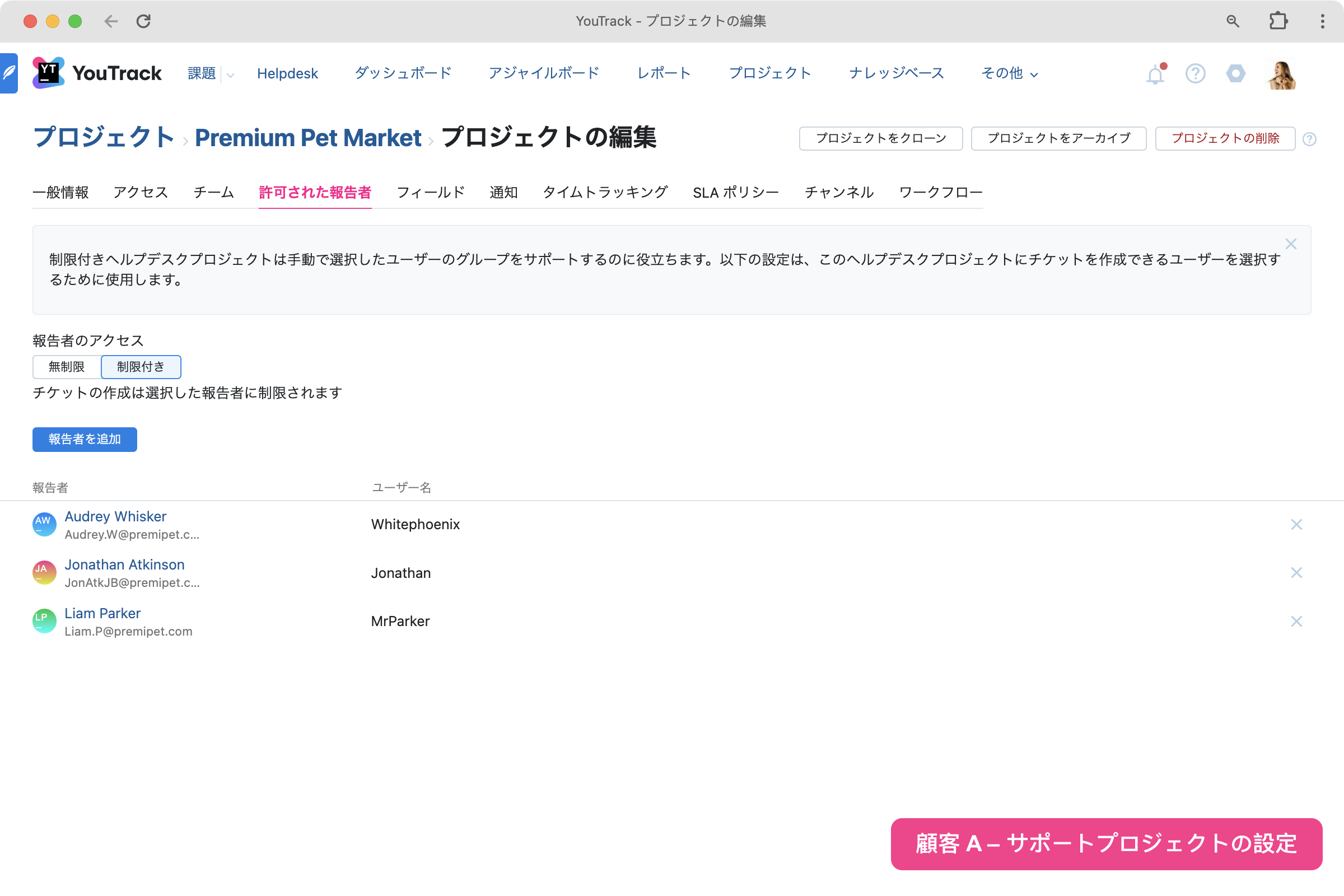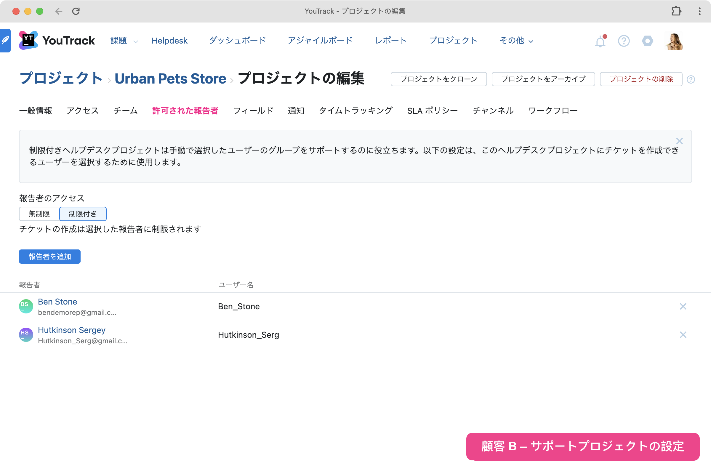 各ヘルプデスクプロジェクトの表示対象を特定の報告者のみに制限できるようになりました。 つまり、あるプロジェクトの報告者が別の報告者グループに制限されているヘルプデスクプロジェクトのチケット、オンラインチケット送信フォーム、およびナレッジベース記事にアクセスできないようにします。 この機能は同じ YouTrack インスタンスを使用して複数のヘルプデスクプロジェクトを担当するサポートチーム向けに導入されました。これは、複数の製品または顧客組織の管理も含まれます。