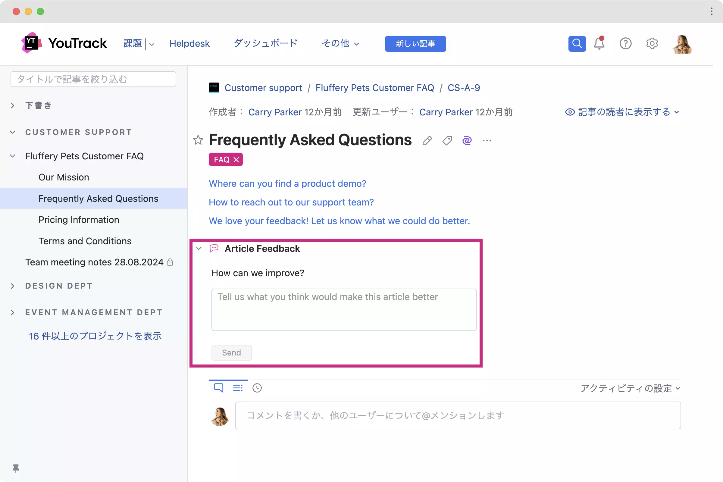 このアプリはナレッジベースに公開された記事のフィードバックを収集します。