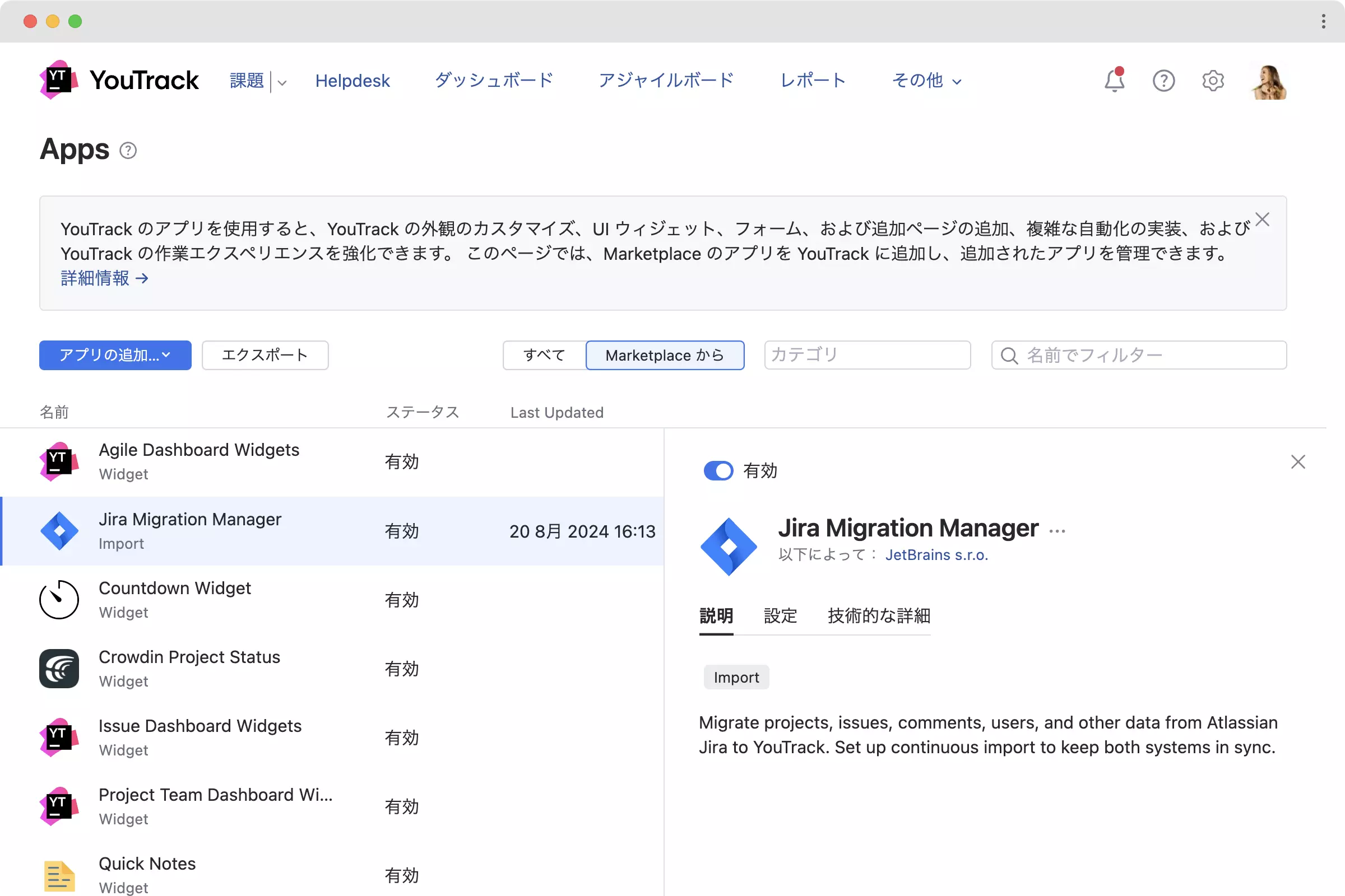 YouTrack には他のシステムからコンテンツをインポートし、一般的なワークフローやウィジェットをダッシュボードに追加するいくつかのアプリがプリインストールされています。