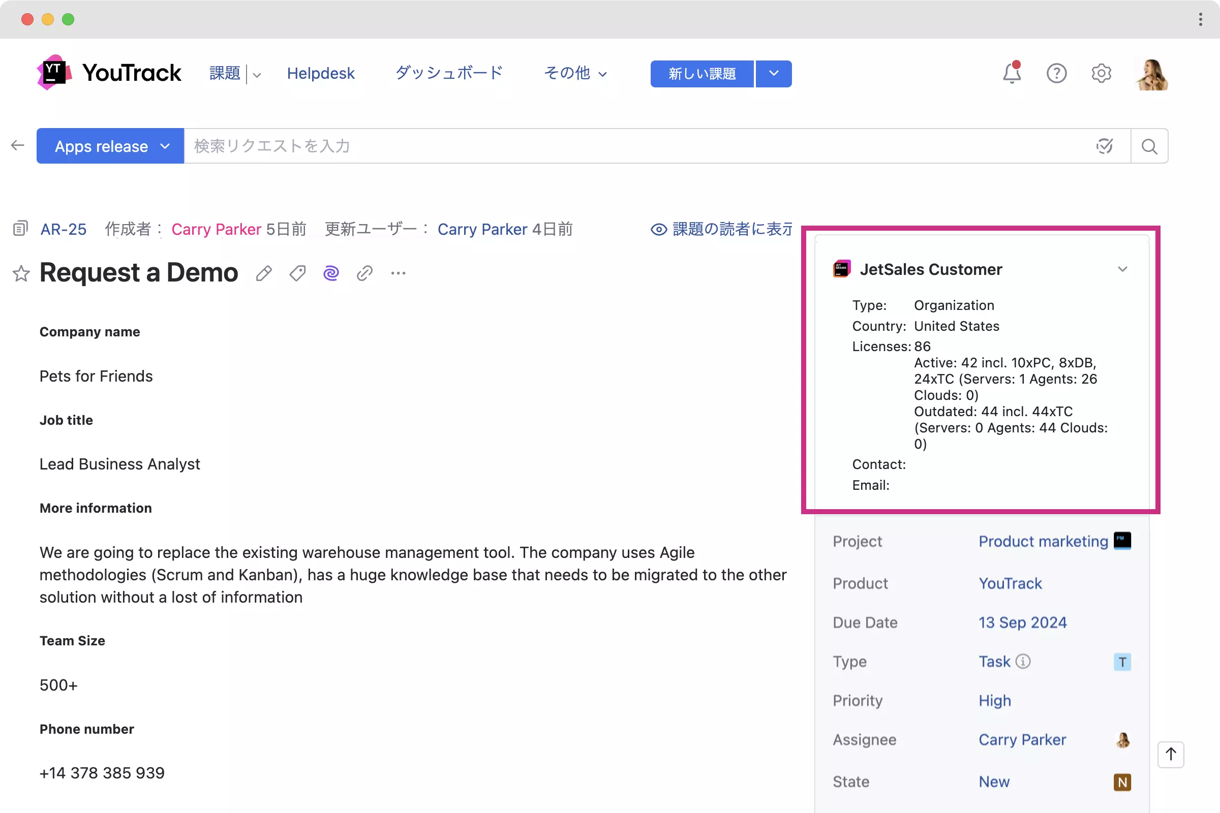 法務関連のニーズに合わせた YouTrack の機能拡張にご関心がある場合は、AgiLawyer チームにお問い合わせの上、デモを予約してカスタマイズのメリットをお確かめください。