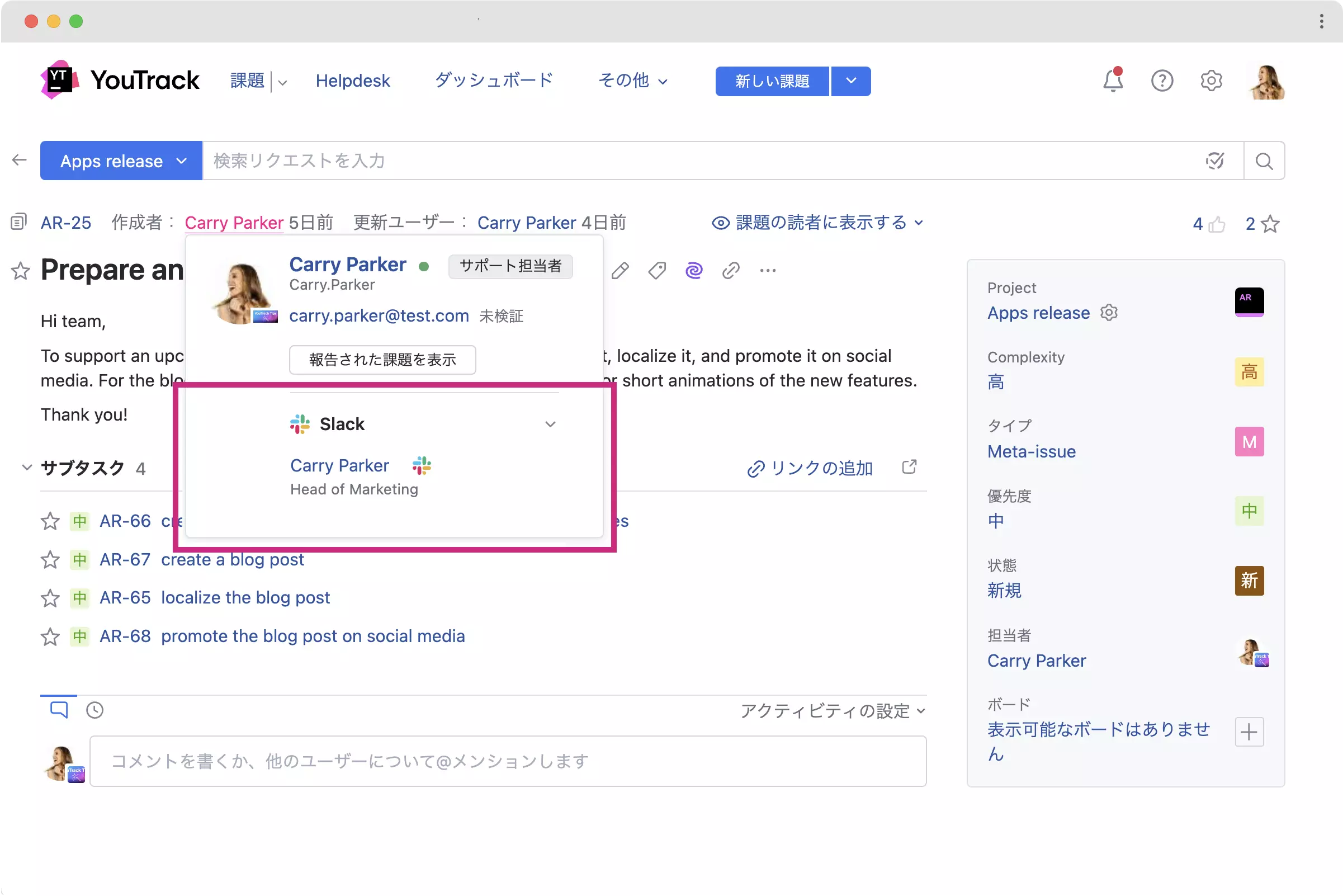 このアプリは Slack プロフィールの情報とステータスを YouTrack のユーザーカードに追加します。