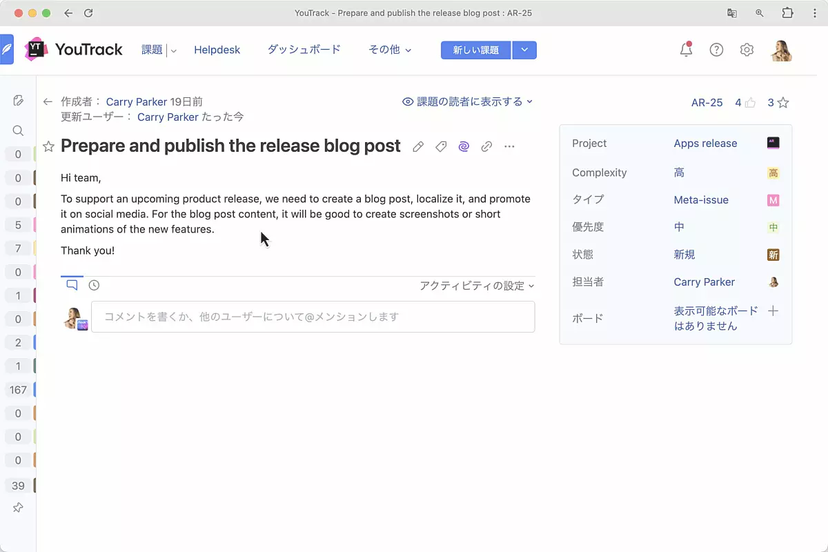 このリリースでは、独自のアプリを作成したり外部のアプリをインストールしたりしてチームのワークフローを支援できるようになりました。 YouTrack でアプリを使用すると、外観のカスタマイズ、UI ウィジェット、フォーム、およびページの追加、ワークフローの複雑な自動化の実装、および作業エクスペリエンスの強化を行えます。