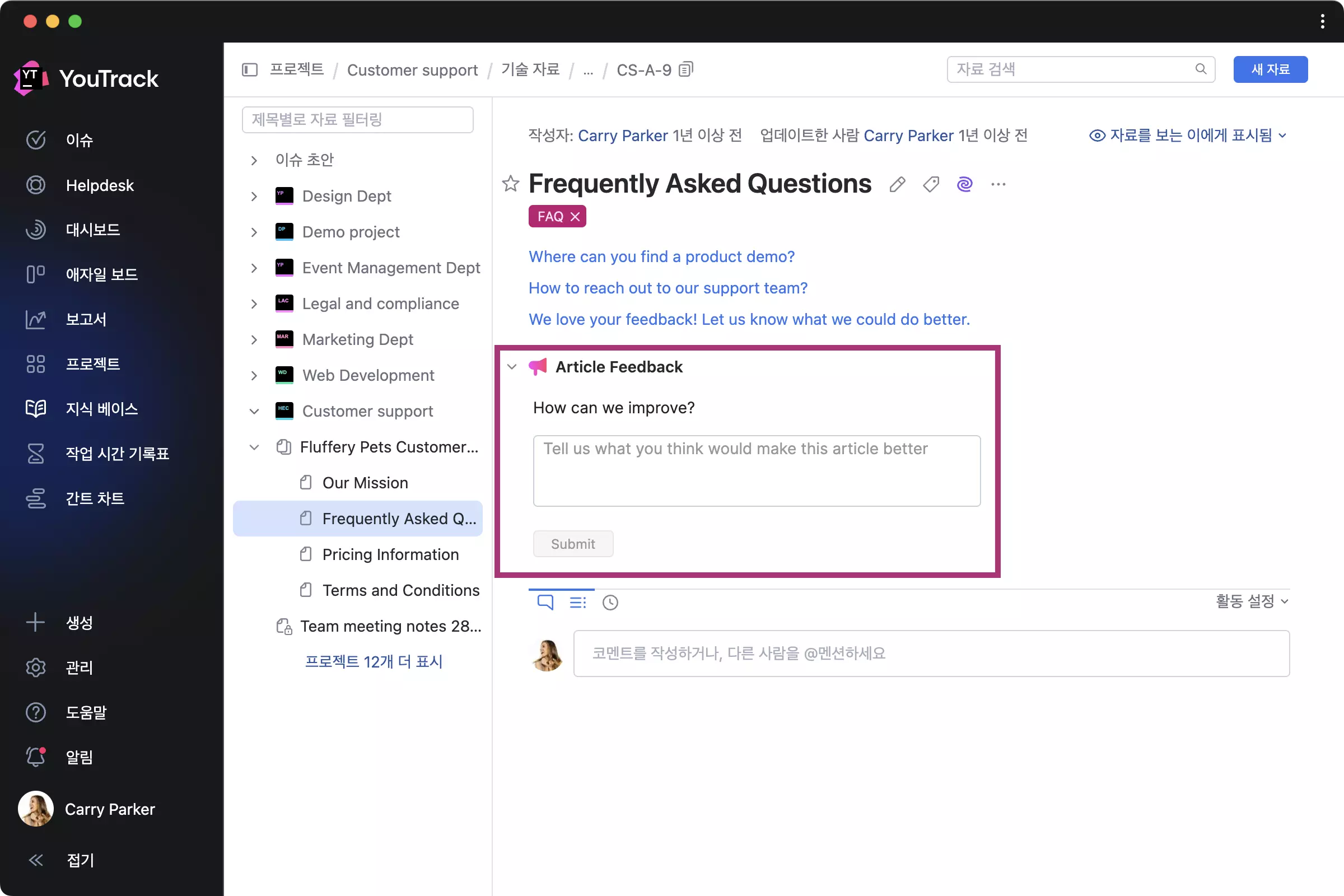 지식 베이스에 게시된 자료에 대한 피드백을 수집합니다.