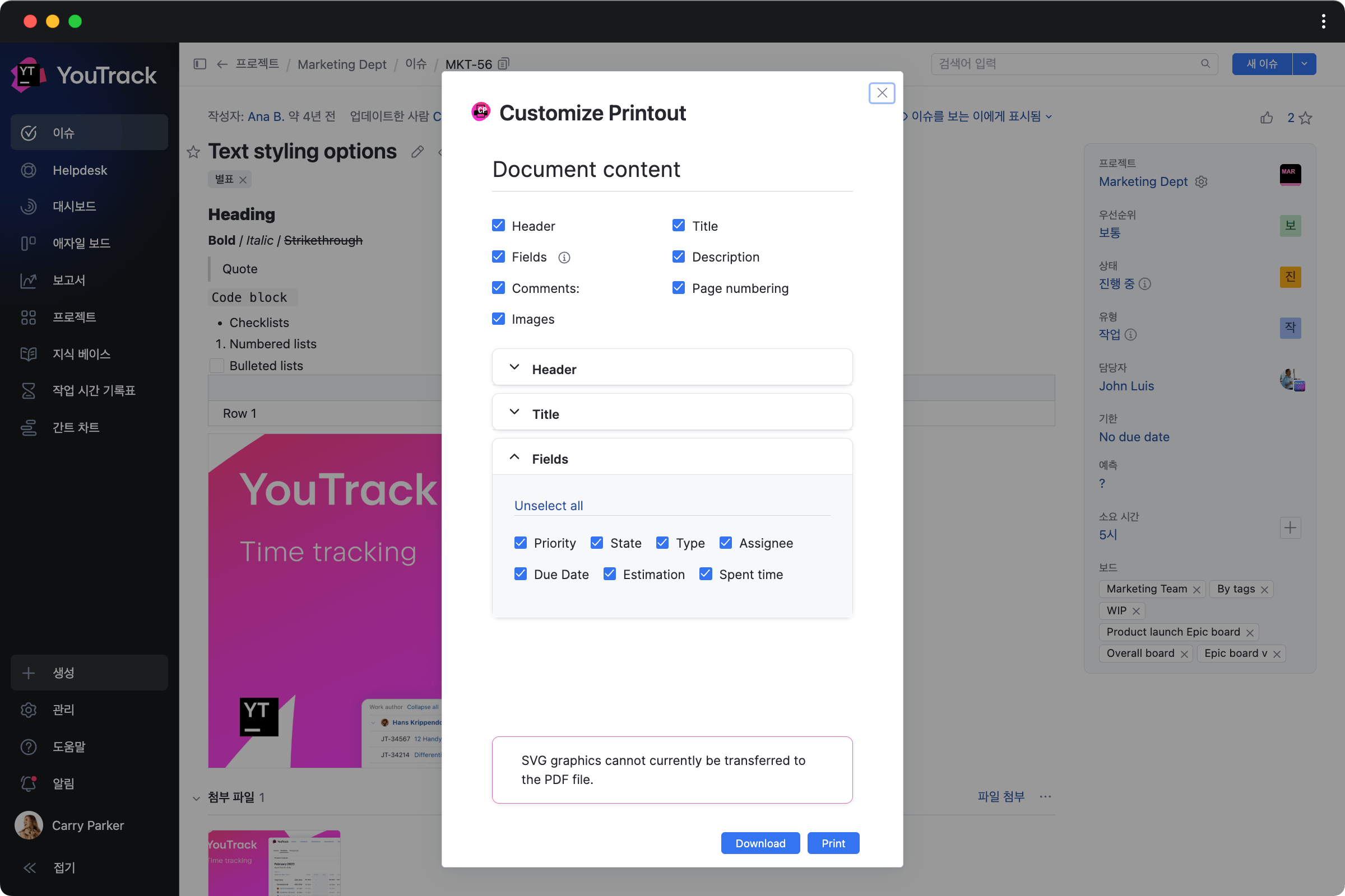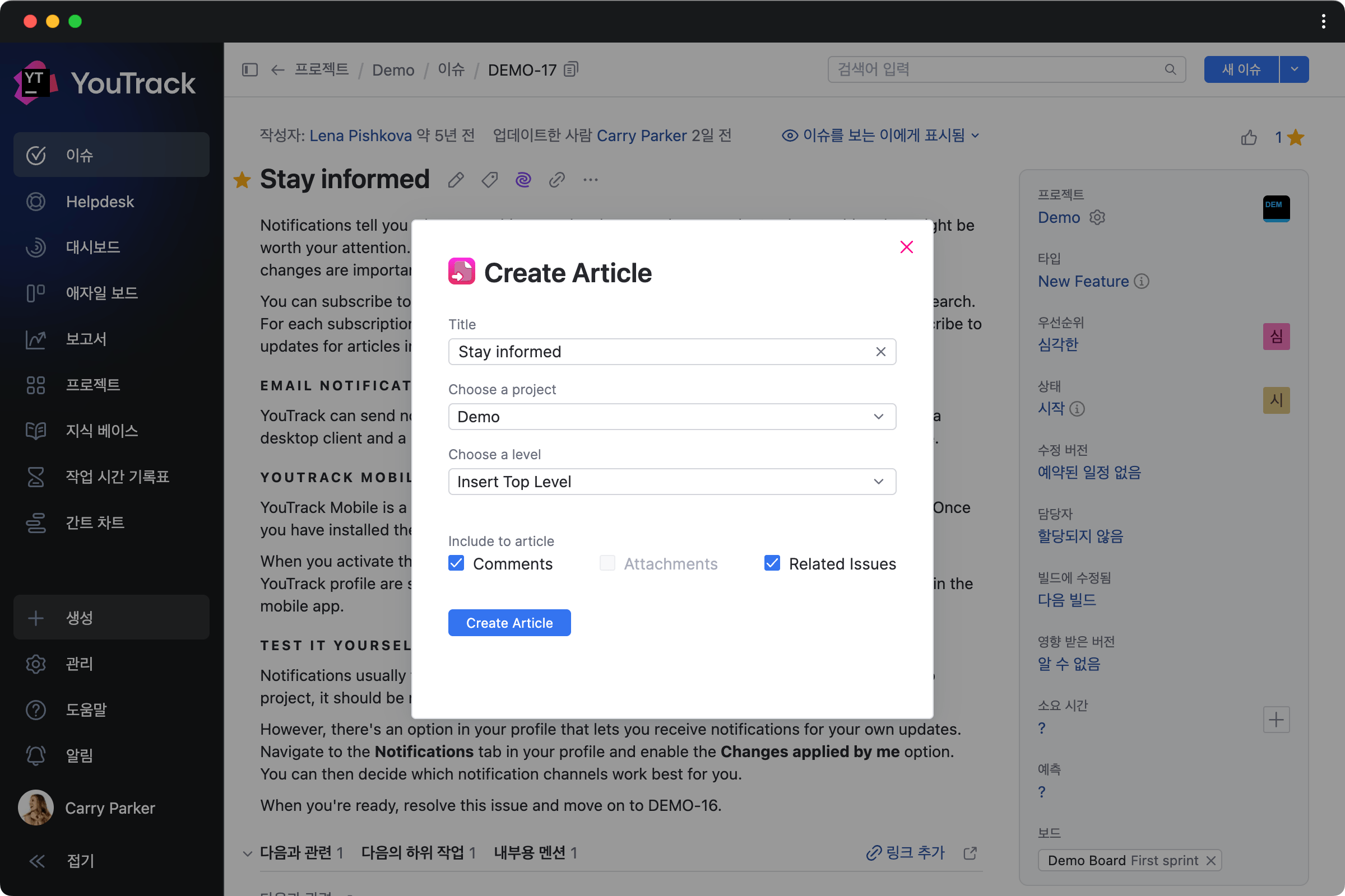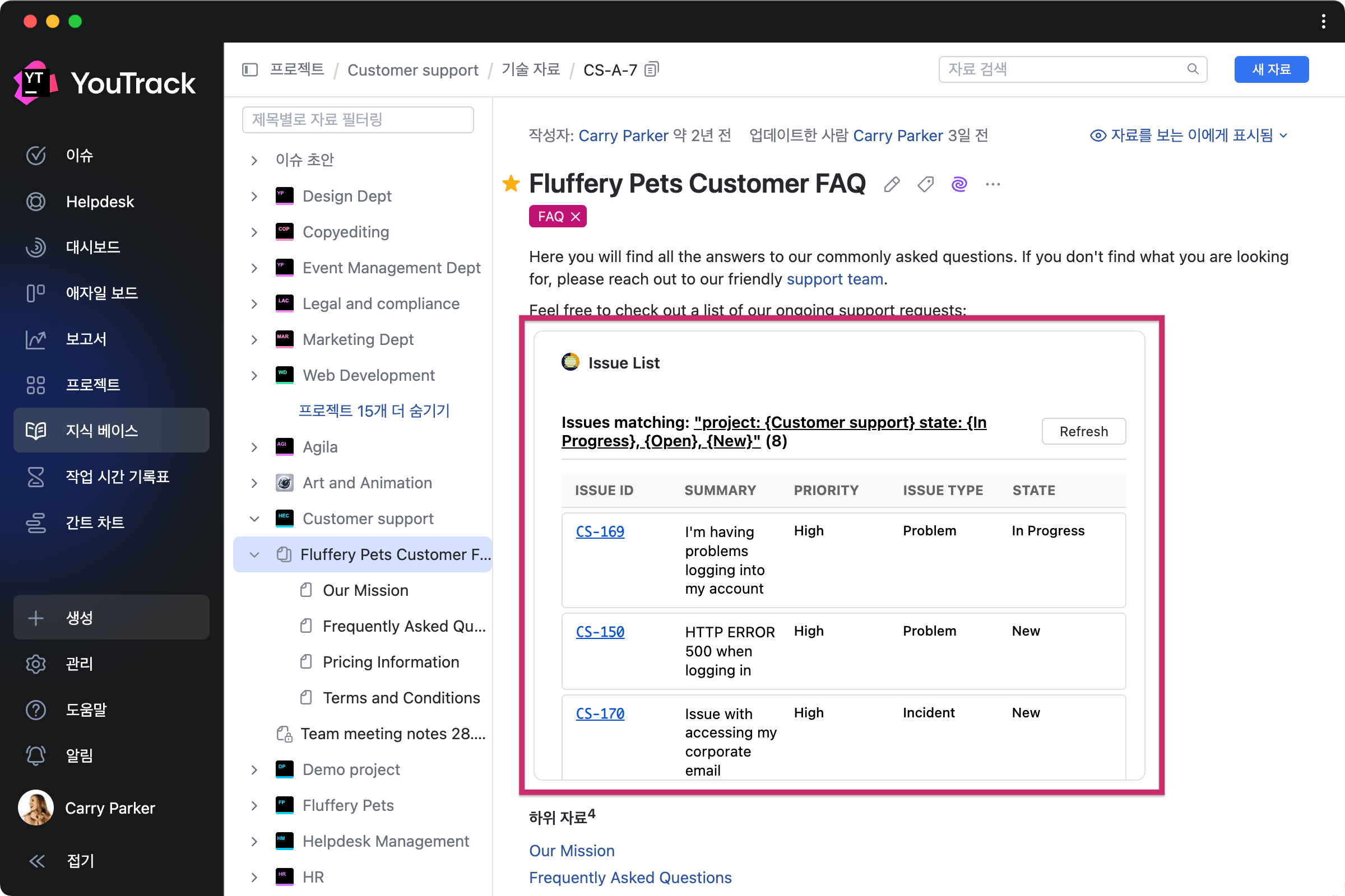 상세한 문서 외에도 Reddit에 YouTrack 커뮤니티가 있어서 아이디어를 논의하고 JetBrains 팀과 커뮤니티 회원으로부터 앱과 워크플로를 구성하기 위한 도움을 받을 수 있습니다.