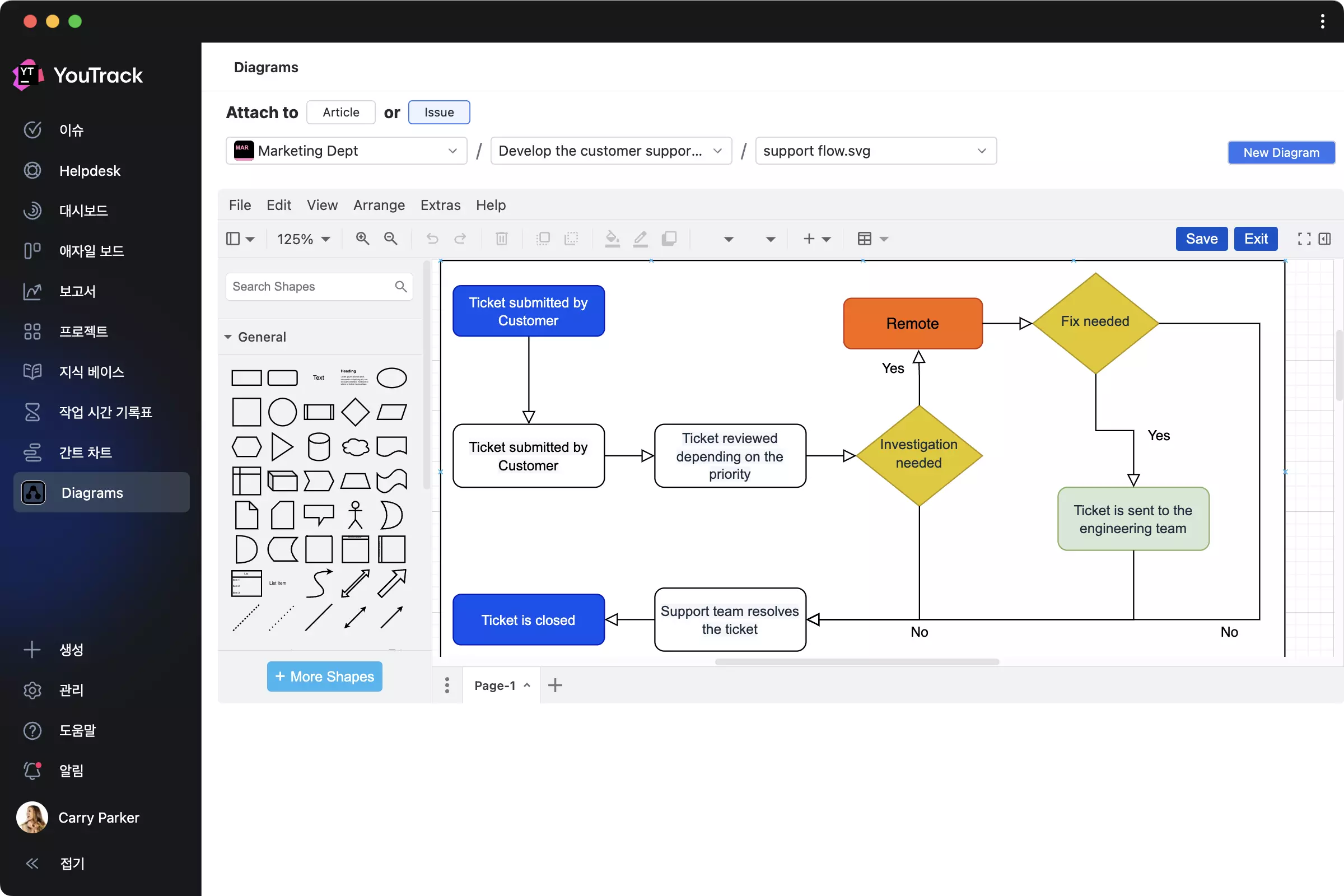 YouTrack 메인 메뉴의 새로운 Diagrams(다이어그램) 섹션에서 draw.io 다이어그램을 생성 및 편집하고 이를 작업과 자료에 포함하여 프로세스를 시각화합니다.