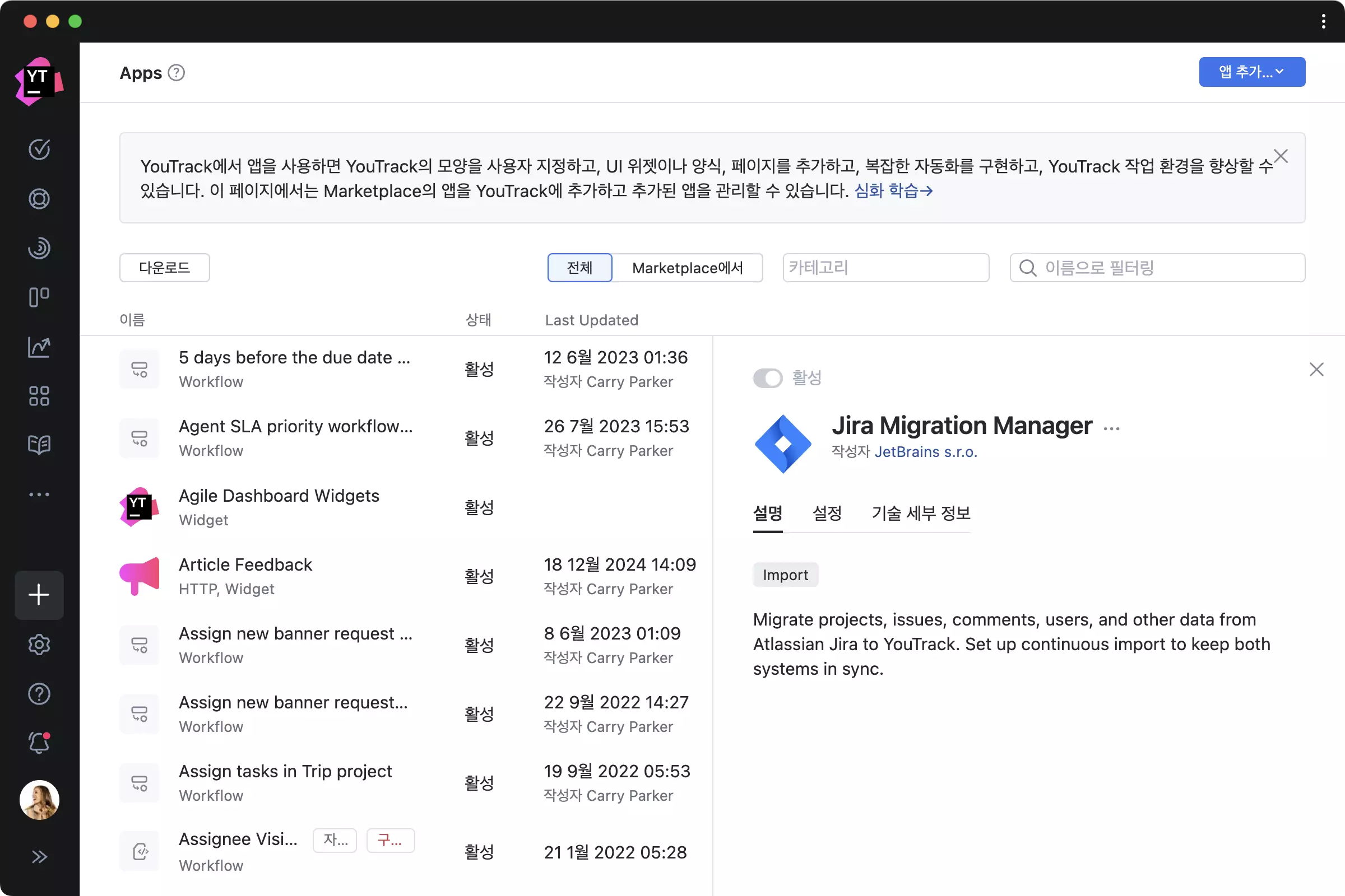 앱을 사용하면 특정 요구 사항에 맞춰 YouTrack에 추가 기능을 추가할 수 있습니다. 다른 도구와 통합하고, 위젯을 추가하여 중요한 데이터를 표시하고, 워크플로를 공유할 수 있습니다. 앱은 YouTrack 환경을 유연하게 확장시켜줍니다. 직접 앱을 만들거나, YouTrack 컨설팅 파트너의 도움을 받거나 JetBrains Marketplace에서 원하는 앱이 이미 제공되고 있는지 확인하세요.