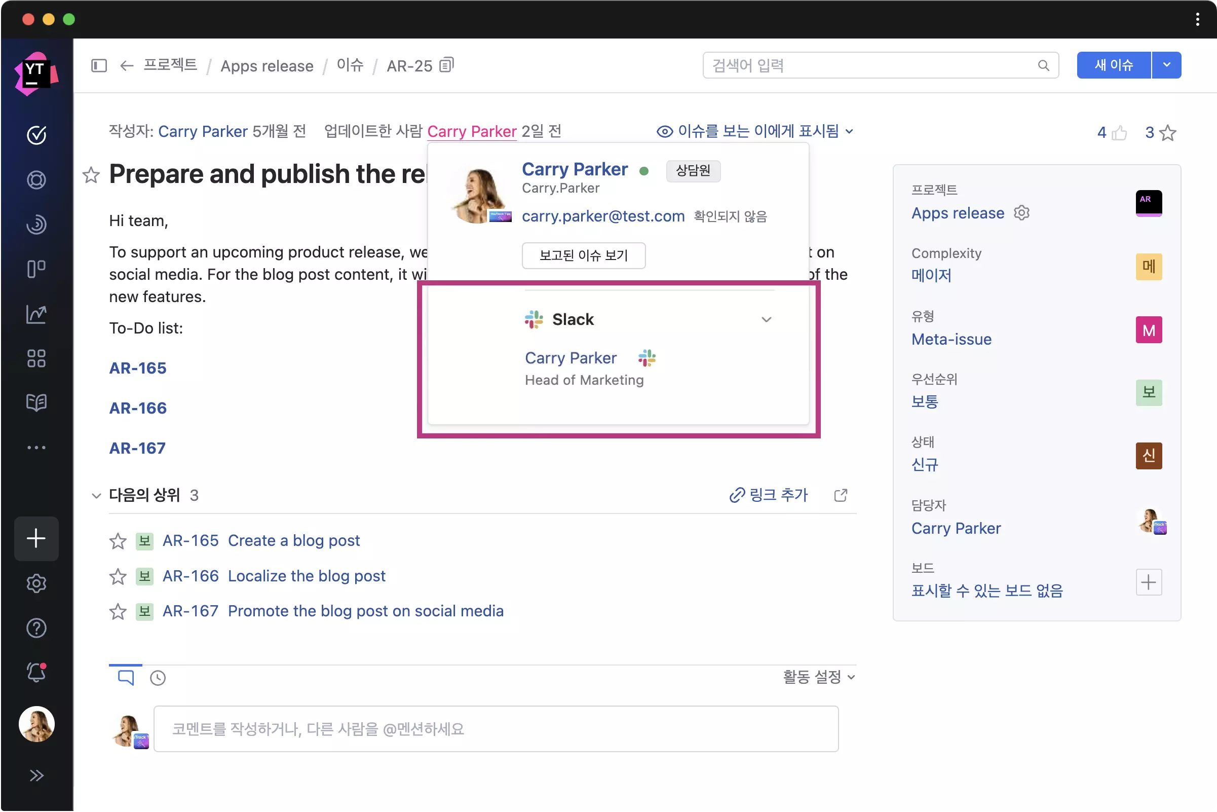 Slack 프로필의 정보와 상태를 YouTrack 사용자 카드에 추가하고, YouTrack에서 바로 Slack 대화를 시작합니다.