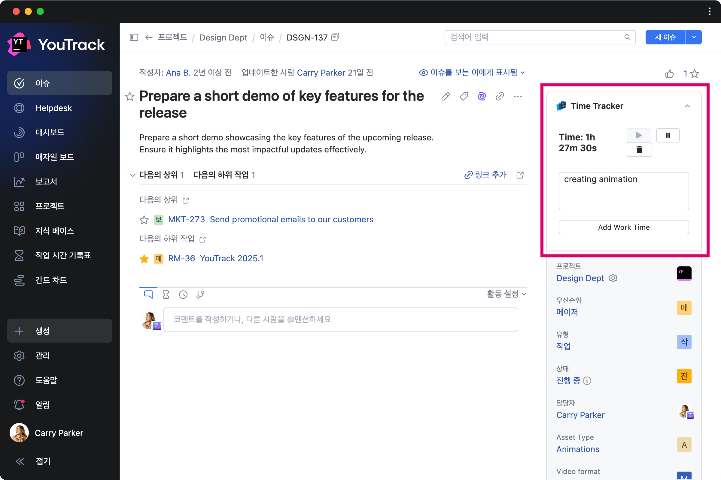 YouTrack에는 일반적인 팀 프로세스를 지원하는 워크플로가 포함된 여러 가지 기본 앱이 있습니다. 예를 들어 모든 하위 작업이 해결되면 상위 이슈를 마감하고, 특정 기간 후에 이슈 우선순위를 높이고, 중복된 이슈를 관리하고, 소요 시간을 추적하는 등의 작업을 수행할 수 있는 워크플로가 있습니다.