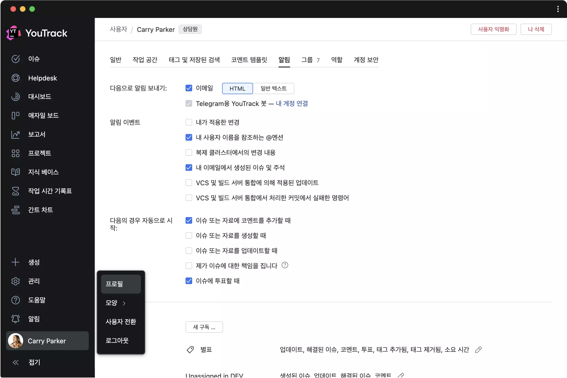 구성 가능한 알림 설정을 사용하여 이메일의 받은 편지함으로 전달할 업데이트 유형을 결정할 수 있습니다. YouTrack에는 업데이트를 수신하는 다른 방법도 많으므로 알림을 완전히 해제할 수도 있습니다!