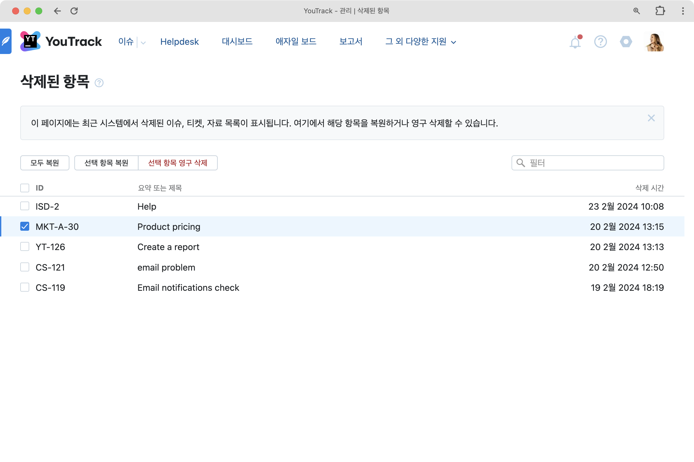 가끔 중요한 이슈, 티켓 또는 자료가 의도치 않게 삭제되는 경우가 있습니다. 이제 관리자가 삭제 후 2주 이내에 언제든지 삭제된 콘텐츠를 쉽게 복구할 수 있습니다. 또한, 항목을 의도적으로 삭제한 경우 이제 해당 항목을 영구적으로 제거하여 저장 공간을 확보할 수 있습니다. 또한 알림 및 활동 스트림을 확인하여 삭제되거나 복원된 항목에 대한 최신 정보를 계속 확인할 수 있습니다.