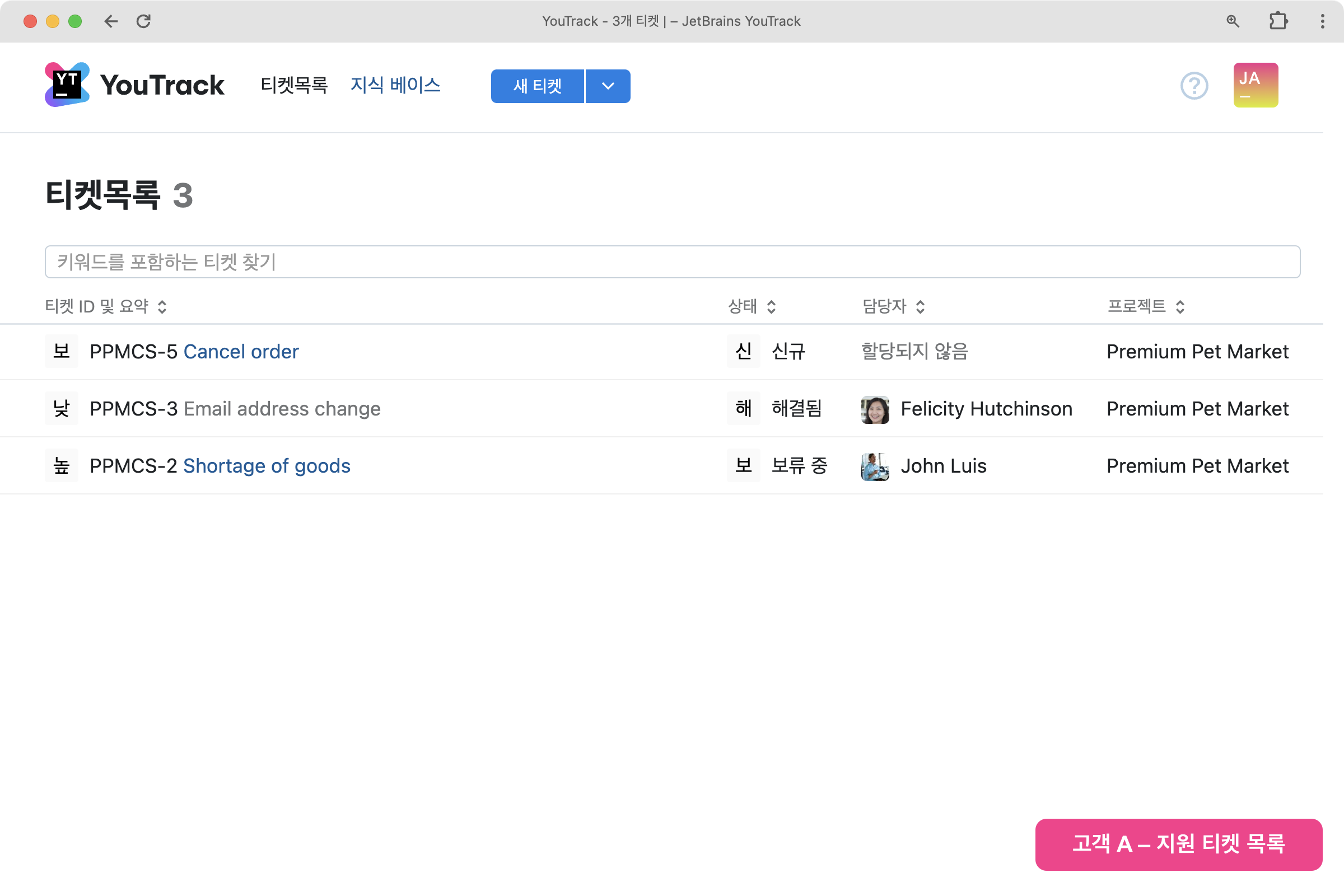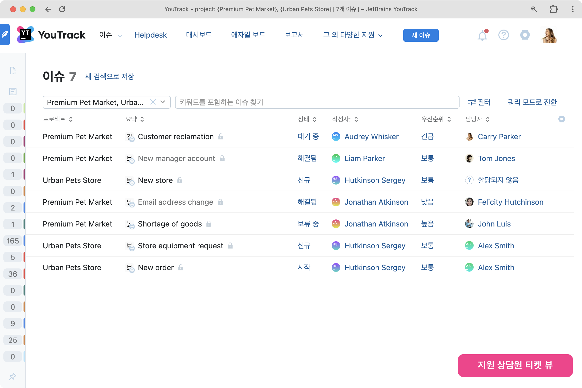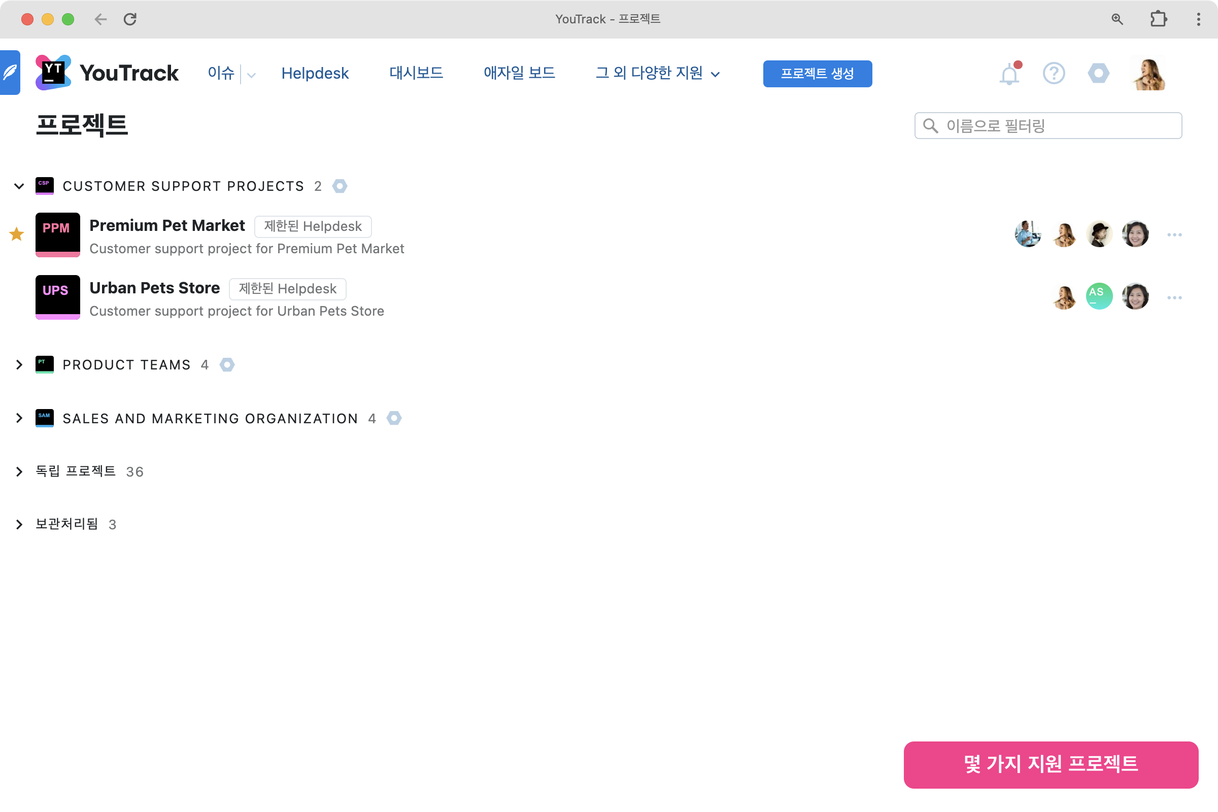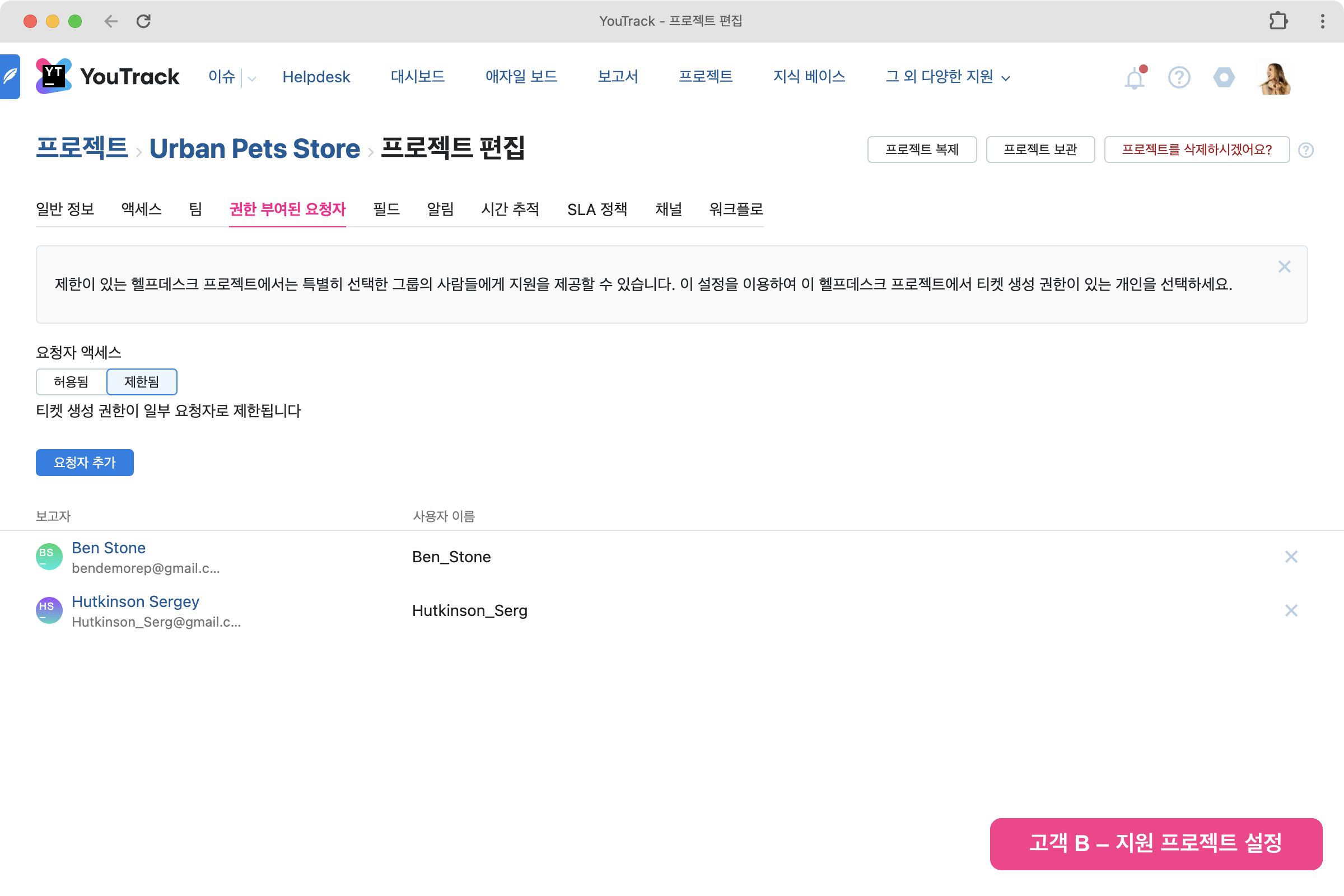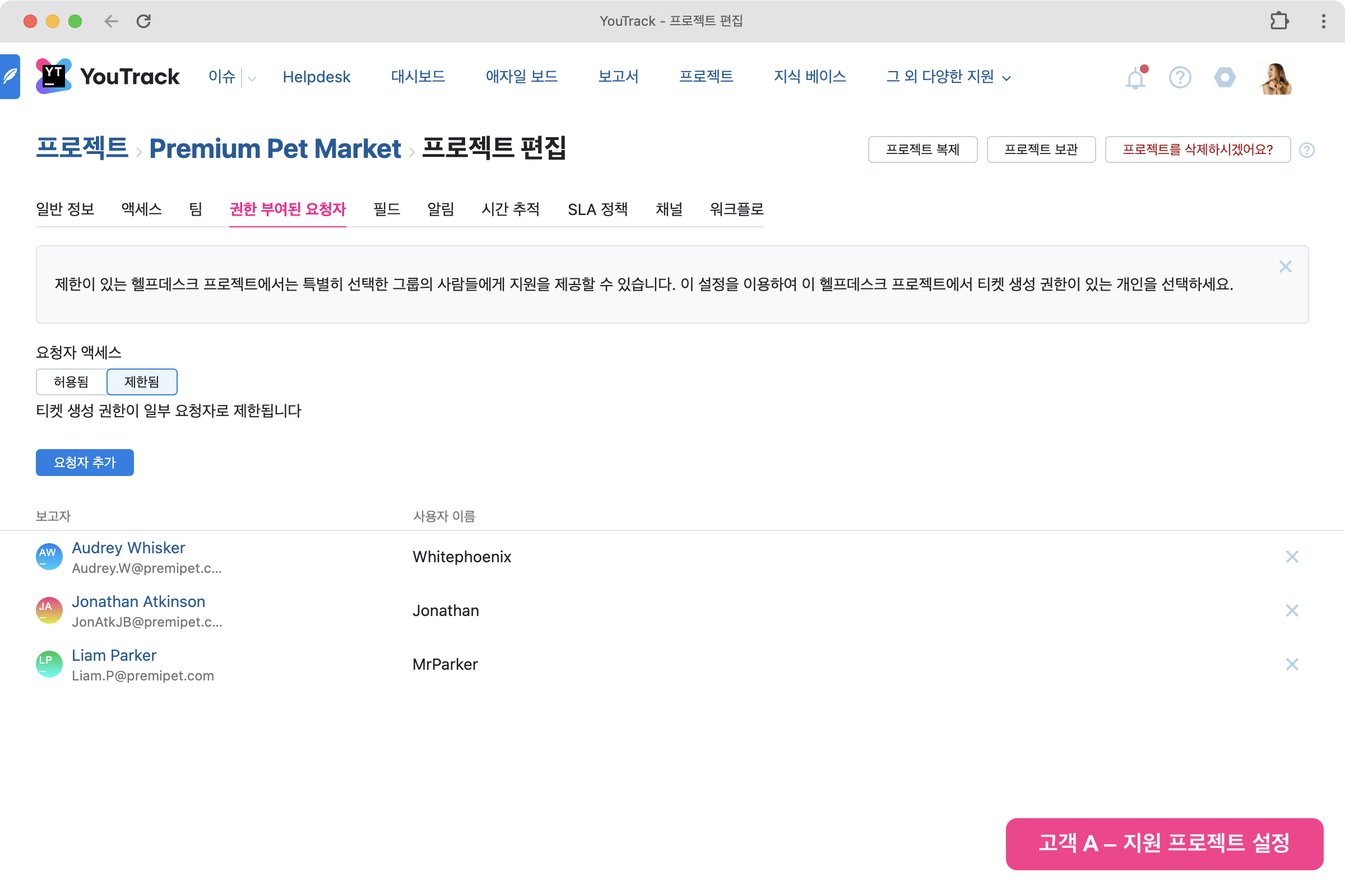 이제 각 헬프데스크 프로젝트가 특정 요청자에게만 표시되도록 제한할 수 있습니다. 즉, 한 프로젝트의 요청자는 다른 요청자 그룹으로 제한된 헬프데스크 프로젝트의 티켓, 온라인 티켓 제출 양식 및 지식 베이스 자료에 접근하지 못하도록 제한 할 수 있습니다. 이 기능은 동일한 YouTrack 인스턴스를 사용하여 다양한 제품 또는 고객 조직에 대한 지원 관리를 포함해 여러 헬프데스크 프로젝트를 처리하는 지원 팀을 위해 도입되었습니다.