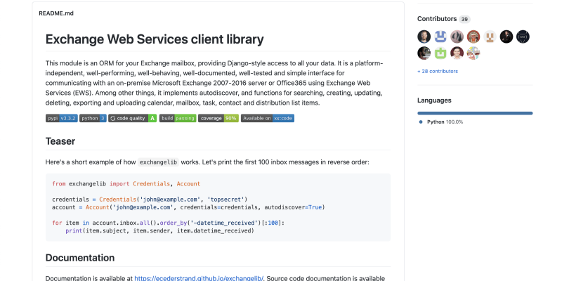 This module is an ORM for your Exchange mailbox, providing Django-style access to all your data. It is a platform-independent, well-performing, well-behaving, well-documented, well-tested, and simple interface for communicating with an on-premises Microsoft Exchange 2007-2016 server or Office365 using Exchange Web Services (EWS). Among other things, it implements autodiscover and functions for searching, creating, updating, deleting, exporting, and uploading calendar, mailbox, task, contact, and distribution list items.