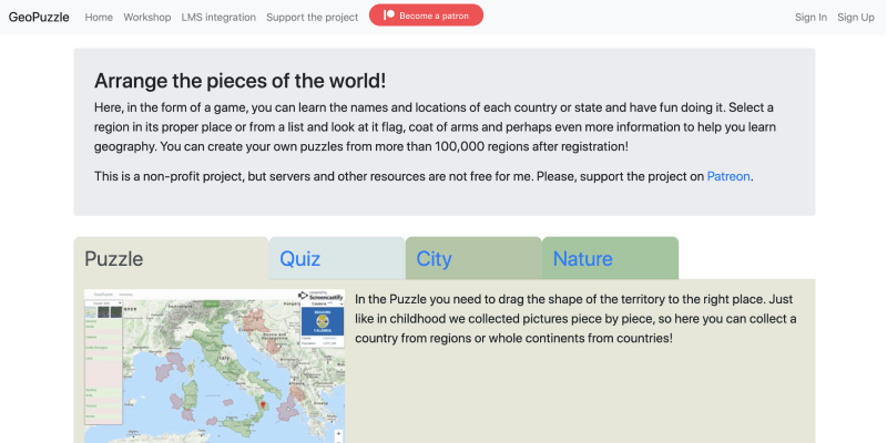 Have fun learning the names and locations of each country or state in the form of a game. Select a region and piece it together with information on the major cities, population, and other interesting information to help you learn geography. Register to create your own puzzles from more than 100,000 regions.