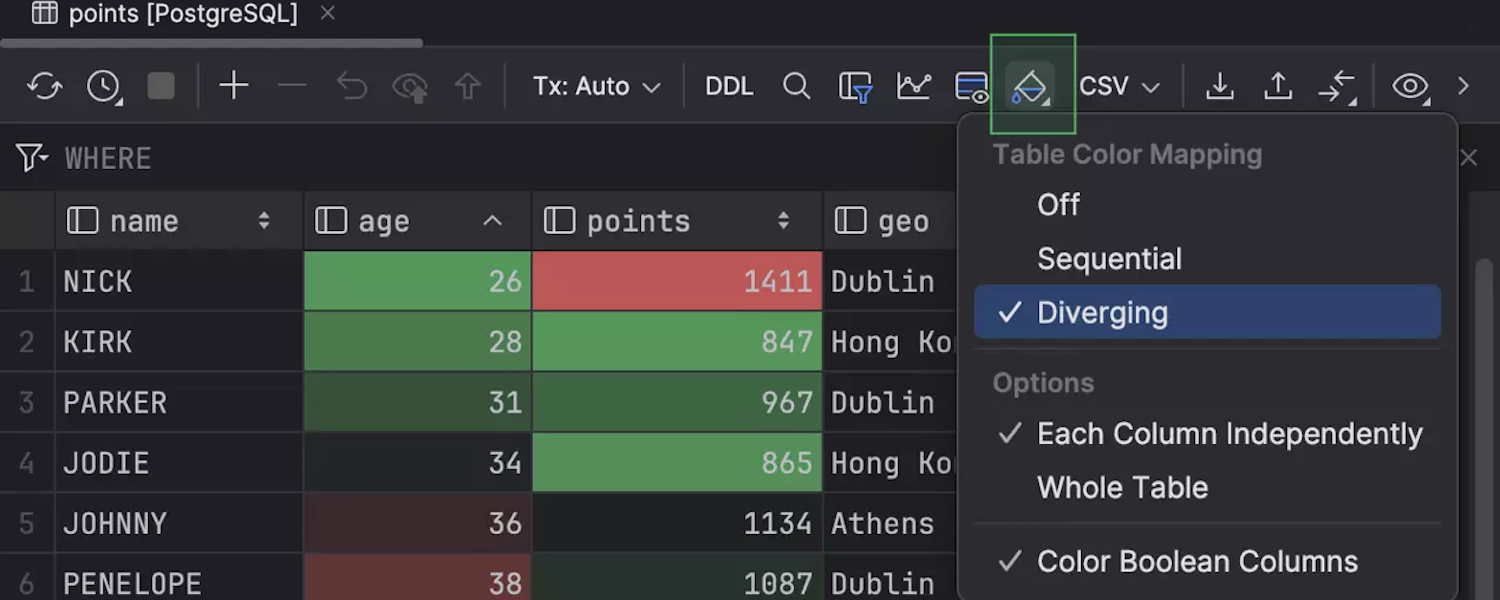 IntelliJ IDEA supports grid heatmaps in the data editor, offering two color schemes: Diverging and Sequential.