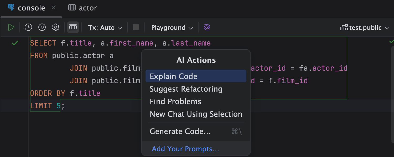 AI Assistant can generate SQL code right in the query console, which is accessible via the Database Tools window.