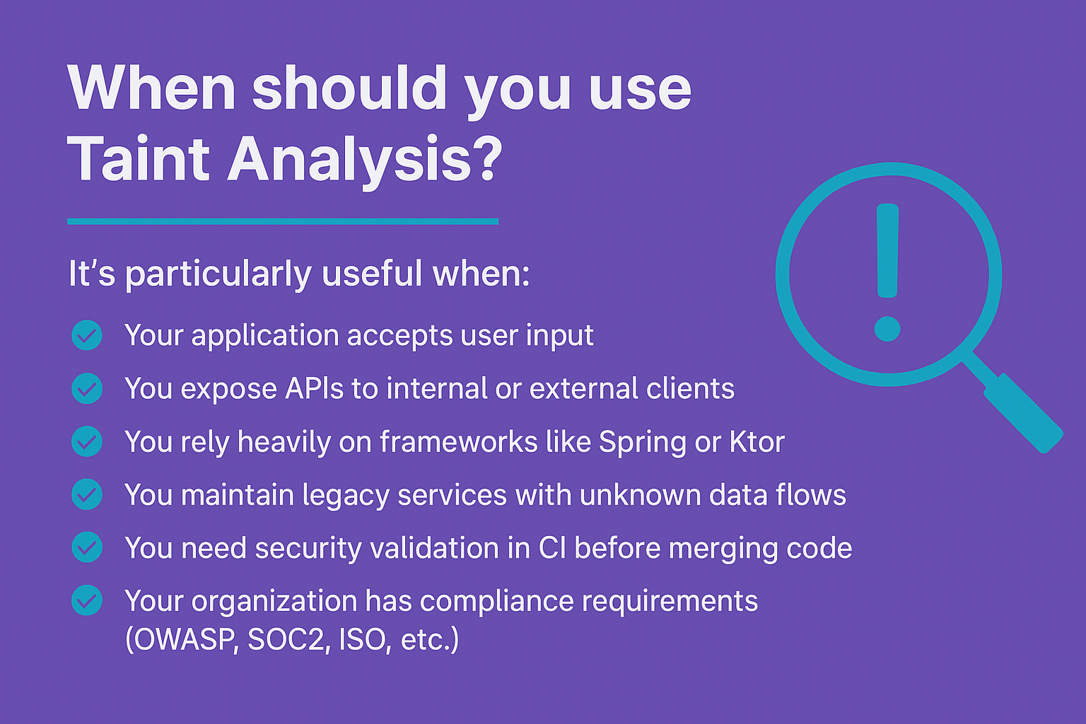 Taint analysis traces the flow of untrusted data (“tainted”) through your application to determine whether it can reach sensitive or dangerous operations (“sinks”) without proper validation or sanitization.