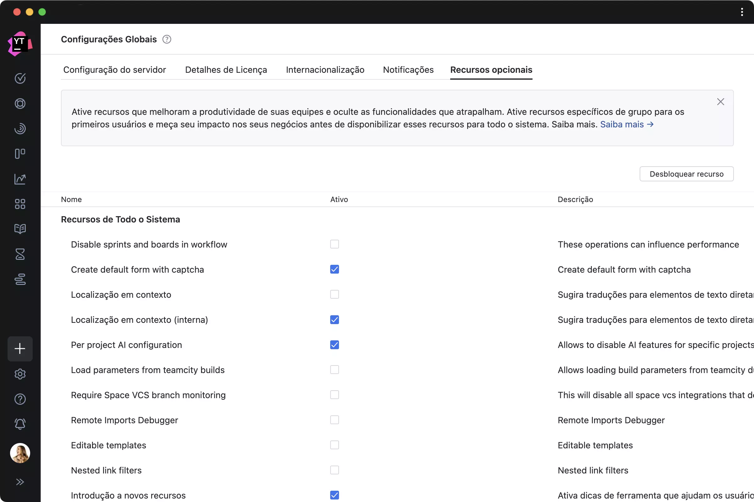 Você pode habilitar recursos experimentais para a sua instância do Cloud ou sua instalação Server. Esses recursos estão em estágios iniciais ou intermediários de desenvolvimento. Essa estratégia nos permite obter feedback sobre os recursos à medida que trabalhamos neles, o que nos ajuda a saber mais sobre o que você deseja ver no produto final.