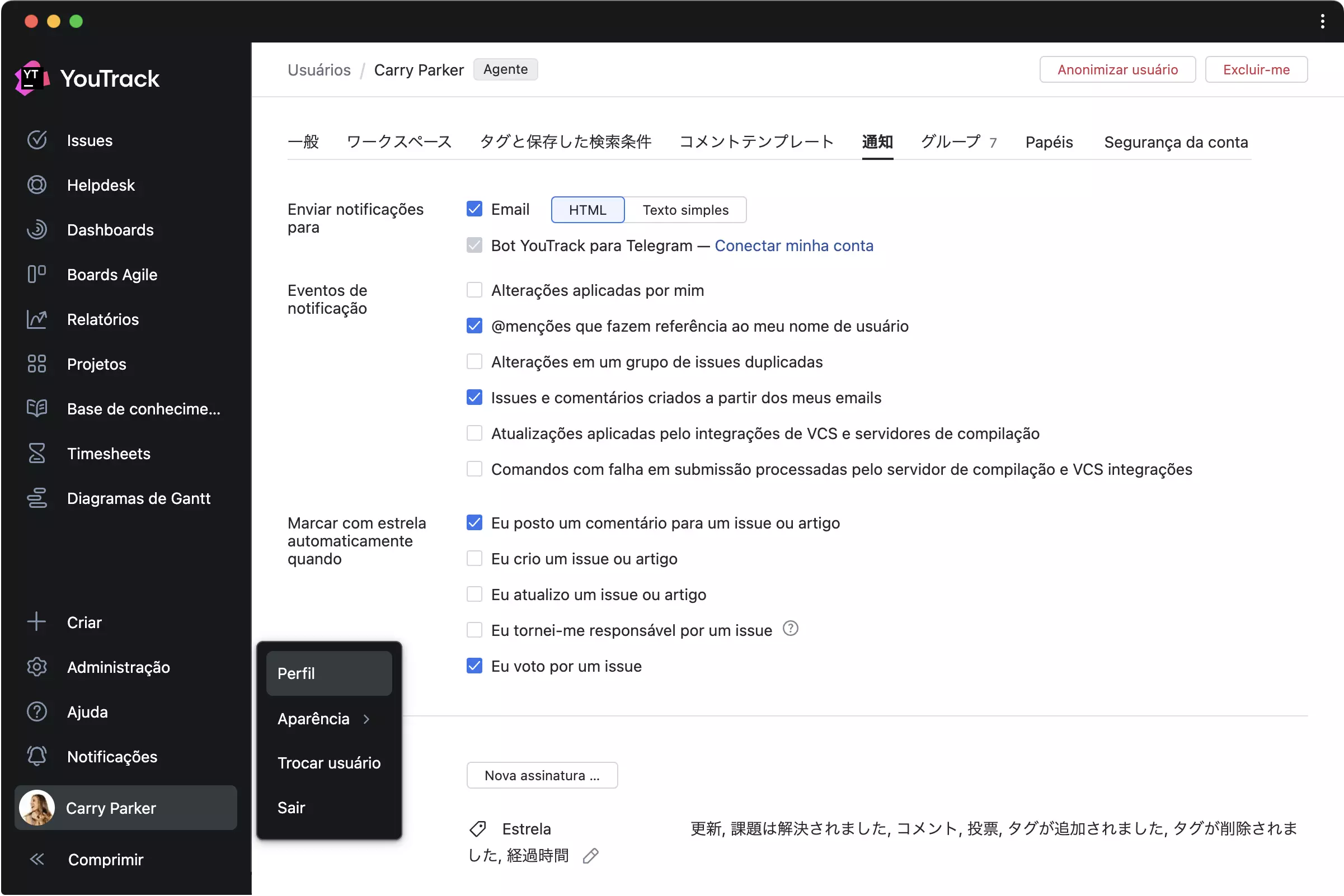 Definições de notificação configuráveis permitem que você decida quais tipos de atualizações são enviadas à sua caixa de entrada de e-mail. É possível até mesmo desativá-las completamente, pois o YouTrack tem muitas outras maneiras de manter você atualizado!