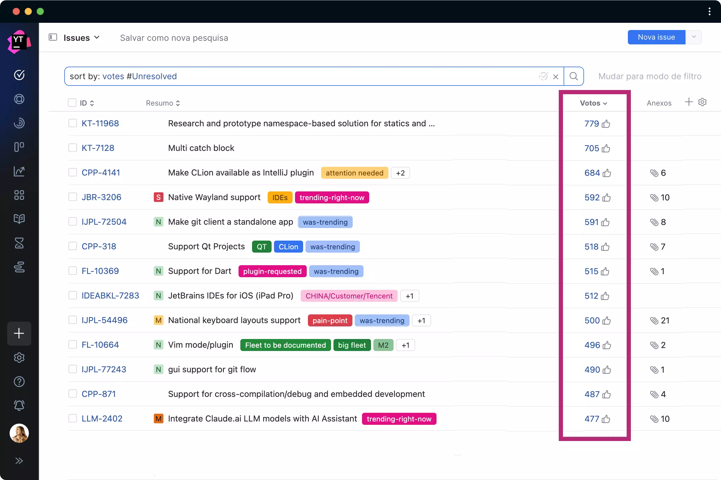 Votar em issues é uma maneira fácil de priorizar sua lista de pendências e envolver sua equipe e clientes na definição do futuro dos seus produtos e serviços.
