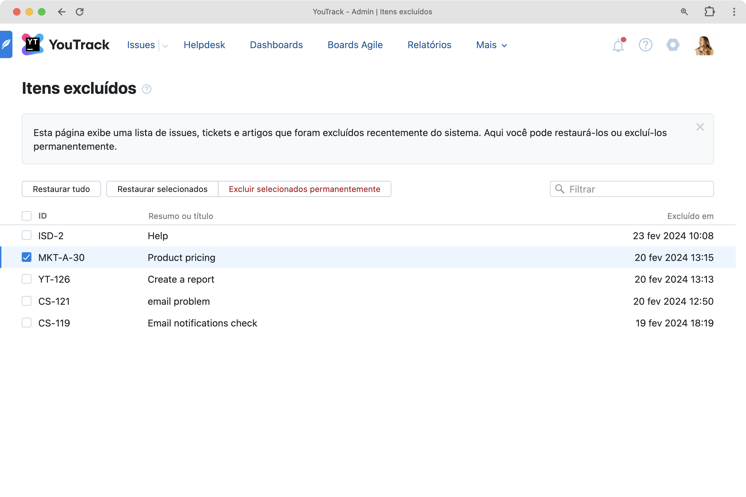 Às vezes, problemas, tickets ou artigos importantes são apagados sem querer. Seus administradores agora podem recuperá-los facilmente, a qualquer momento, dentro de duas semanas após a exclusão. Além disso, se você excluiu os itens de propósito, agora pode removê-los permanentemente para liberar espaço de armazenamento. Você também pode se manter atualizado sobre quais itens foram excluídos ou restaurados simplesmente verificando as notificações e o fluxo de atividades.