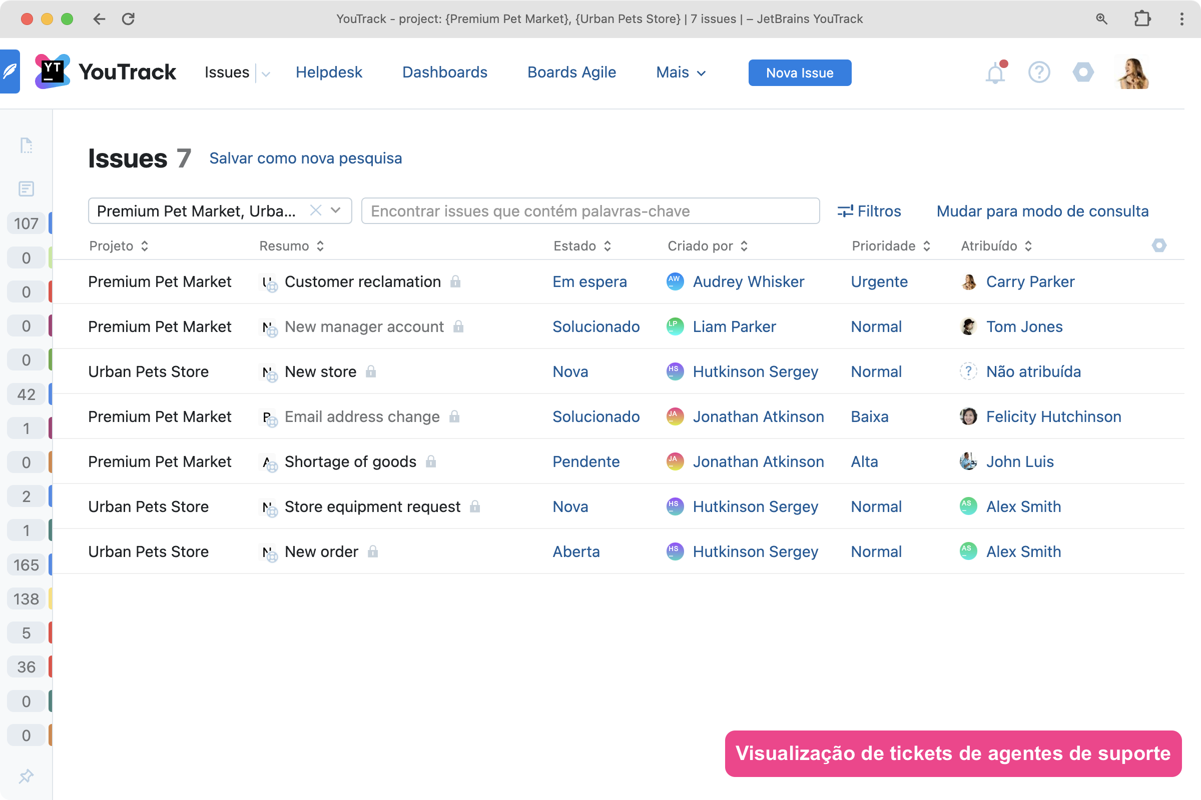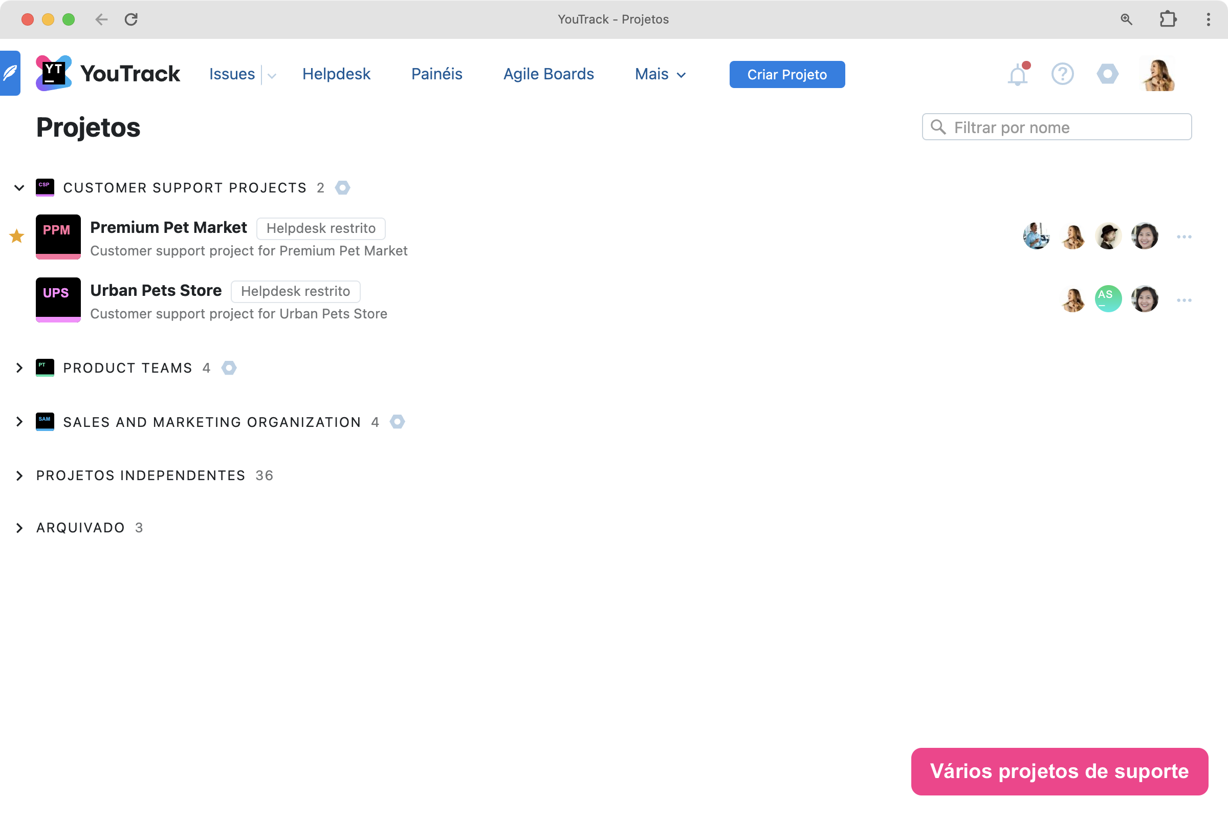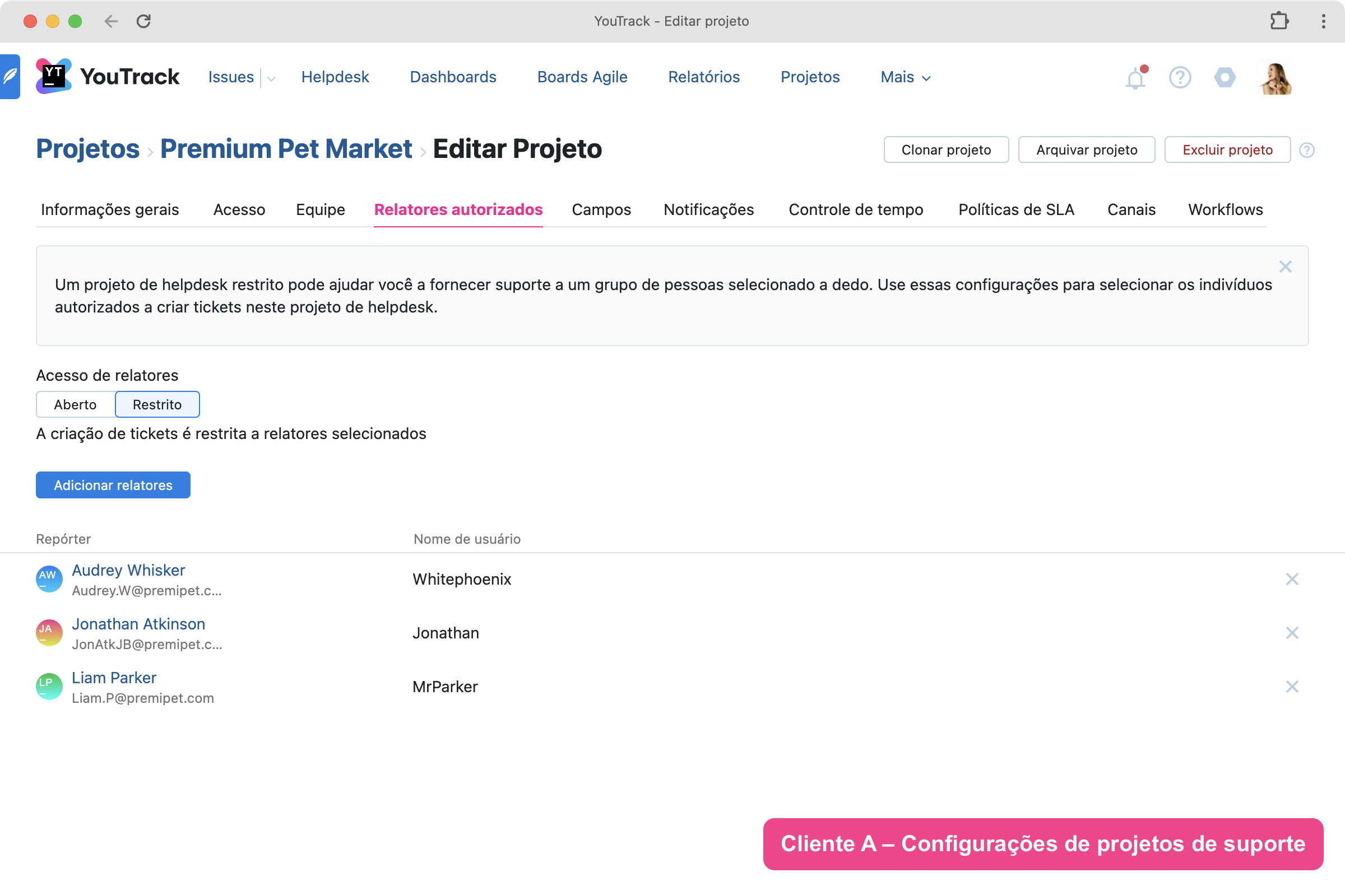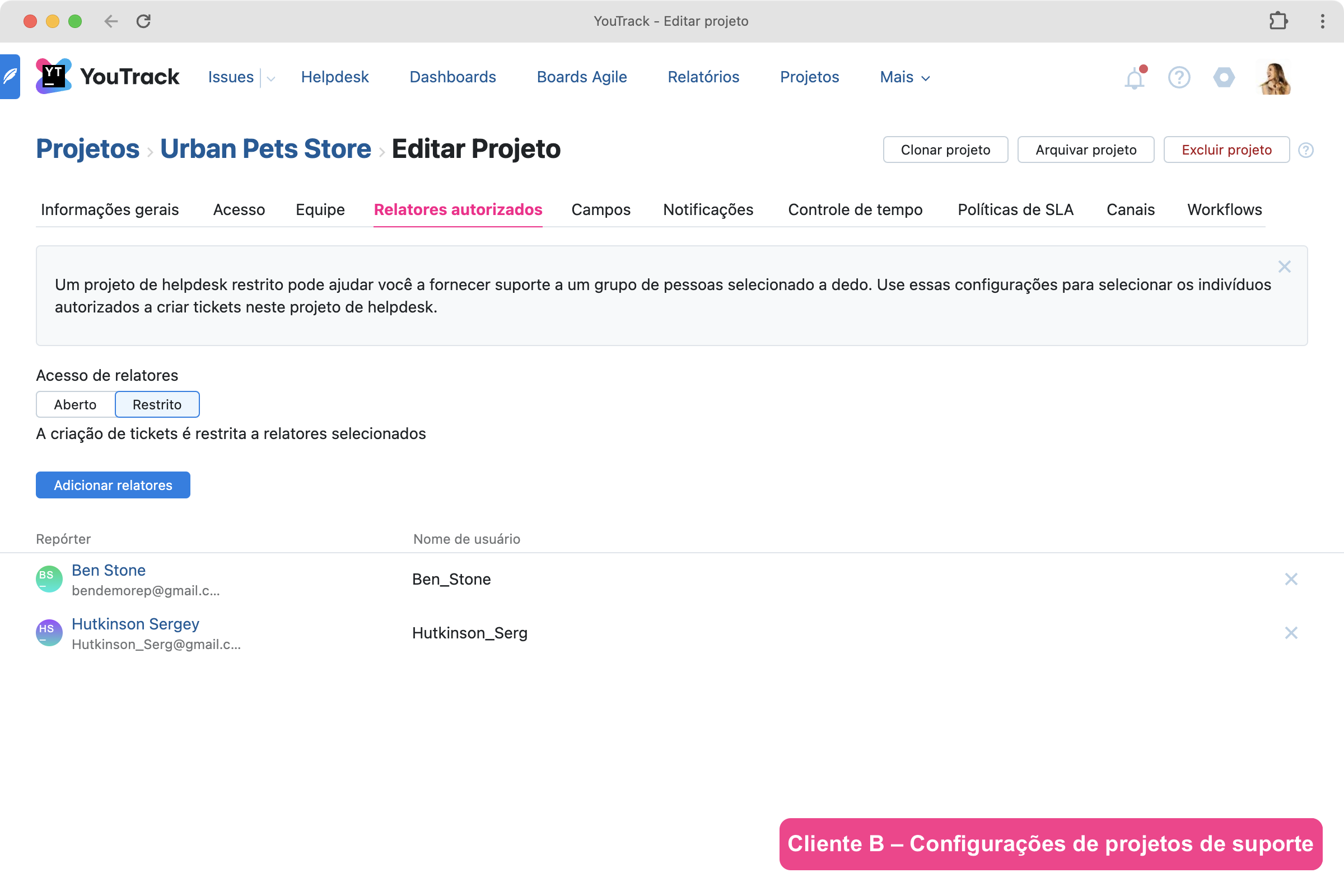 Agora, você pode restringir cada um dos seus projetos de helpdesk para que fiquem visíveis apenas para relatores específicos. Isso significa que os relatores de um projeto não terão acesso a tickets, formulários de envio de tickets online e artigos da Base de Conhecimento de projetos de helpdesk que você restringiu a outro grupo de relatores. Esse recurso foi introduzido para equipes de suporte que usam a mesma instância do YouTrack para lidar com vários projetos de helpdesk, incluindo o gerenciamento de suporte para vários produtos ou organizações de clientes.
