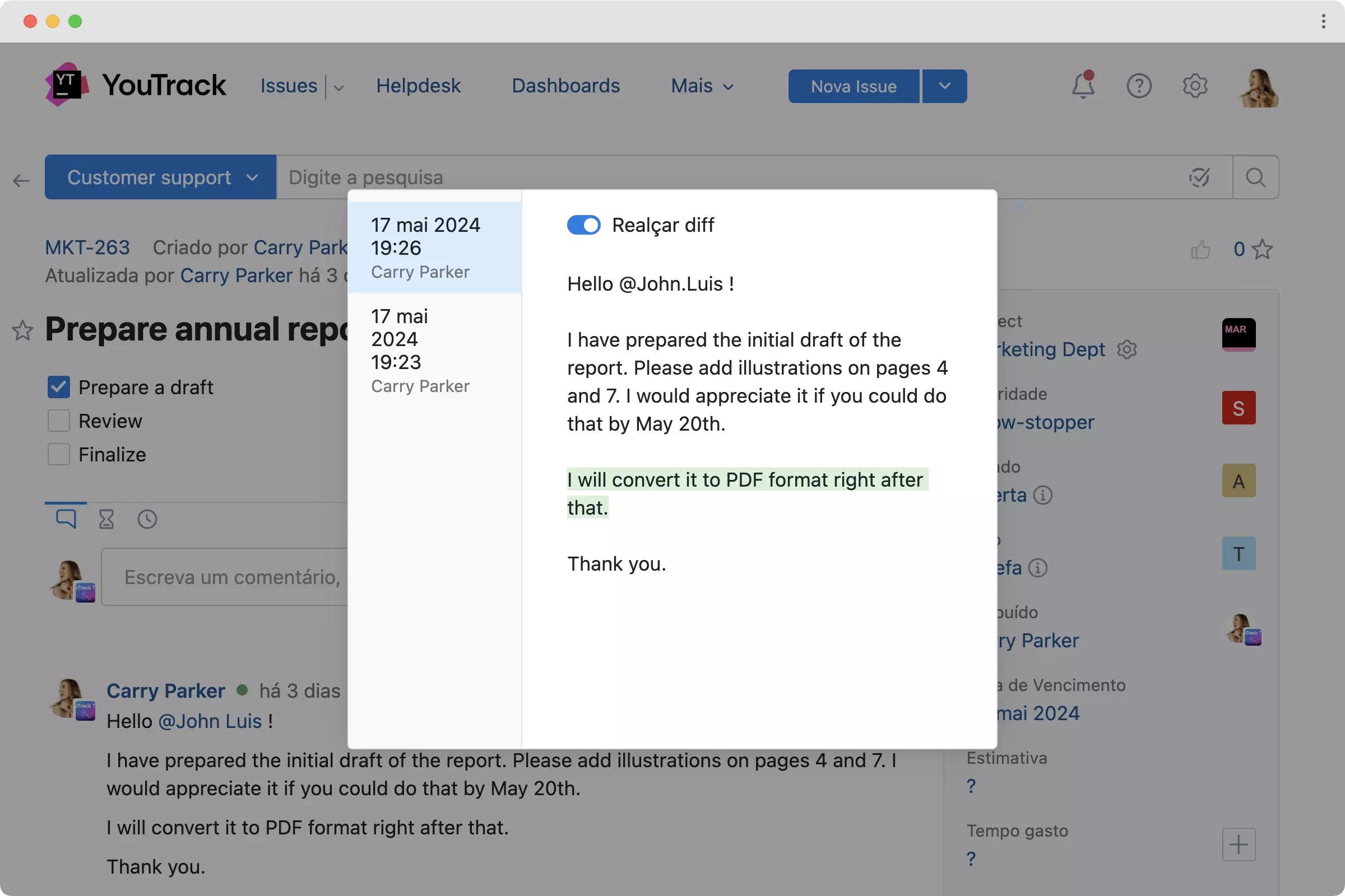 Agora você pode analisar o histórico completo das alterações aplicadas às descrições de issues, a artigos ou comentários. Essa transparência ajuda você a saber quem fez cada alteração e quando. Se a alteração tiver sido feita por engano ou precisar ser desfeita, você pode restaurar uma versão anterior a qualquer momento.