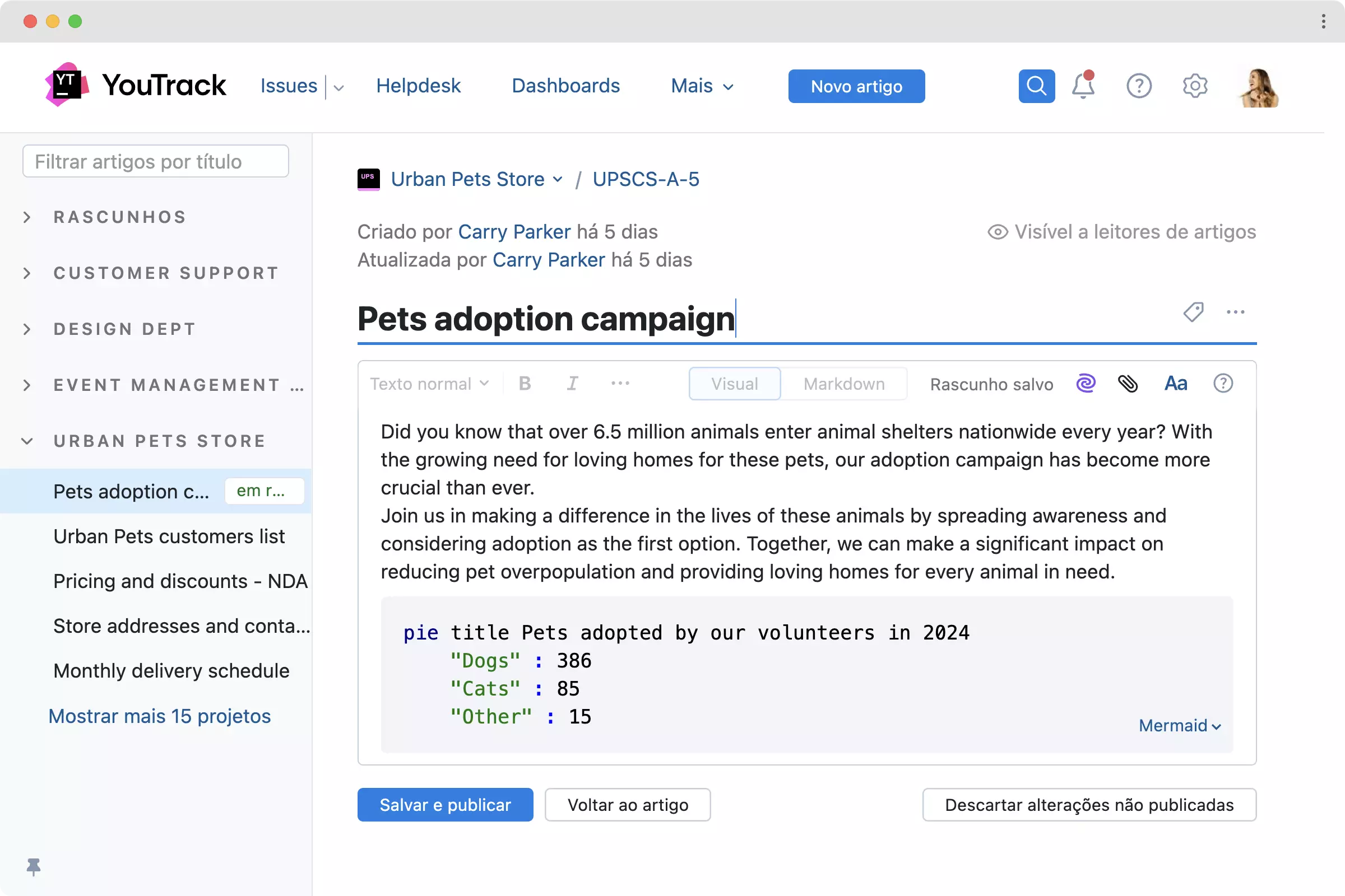 Agora o YouTrack tem suporte a diagramas e gráficos criados usando a marcação do Mermaid. Você pode adicioná-los às suas tarefas ou artigos e compartilhá-los em comentários — até mesmo em comentários in-line em uma base de conhecimentos. Basta incluir um trecho de código para o diagrama e ele será exibido automaticamente.