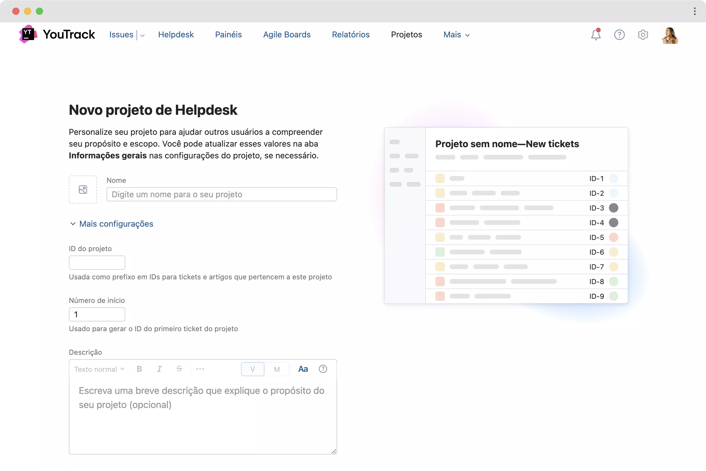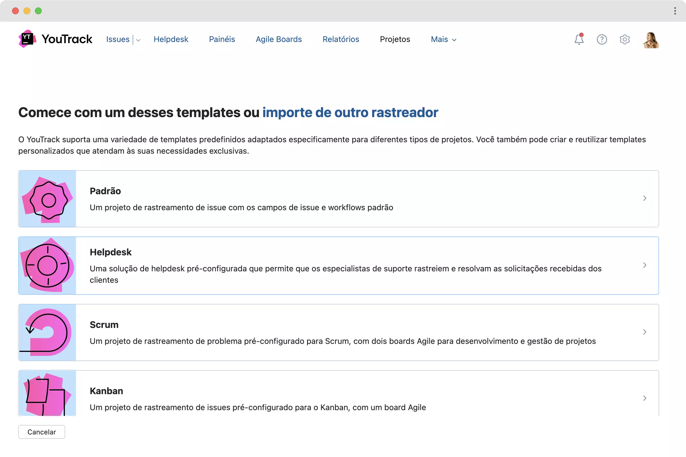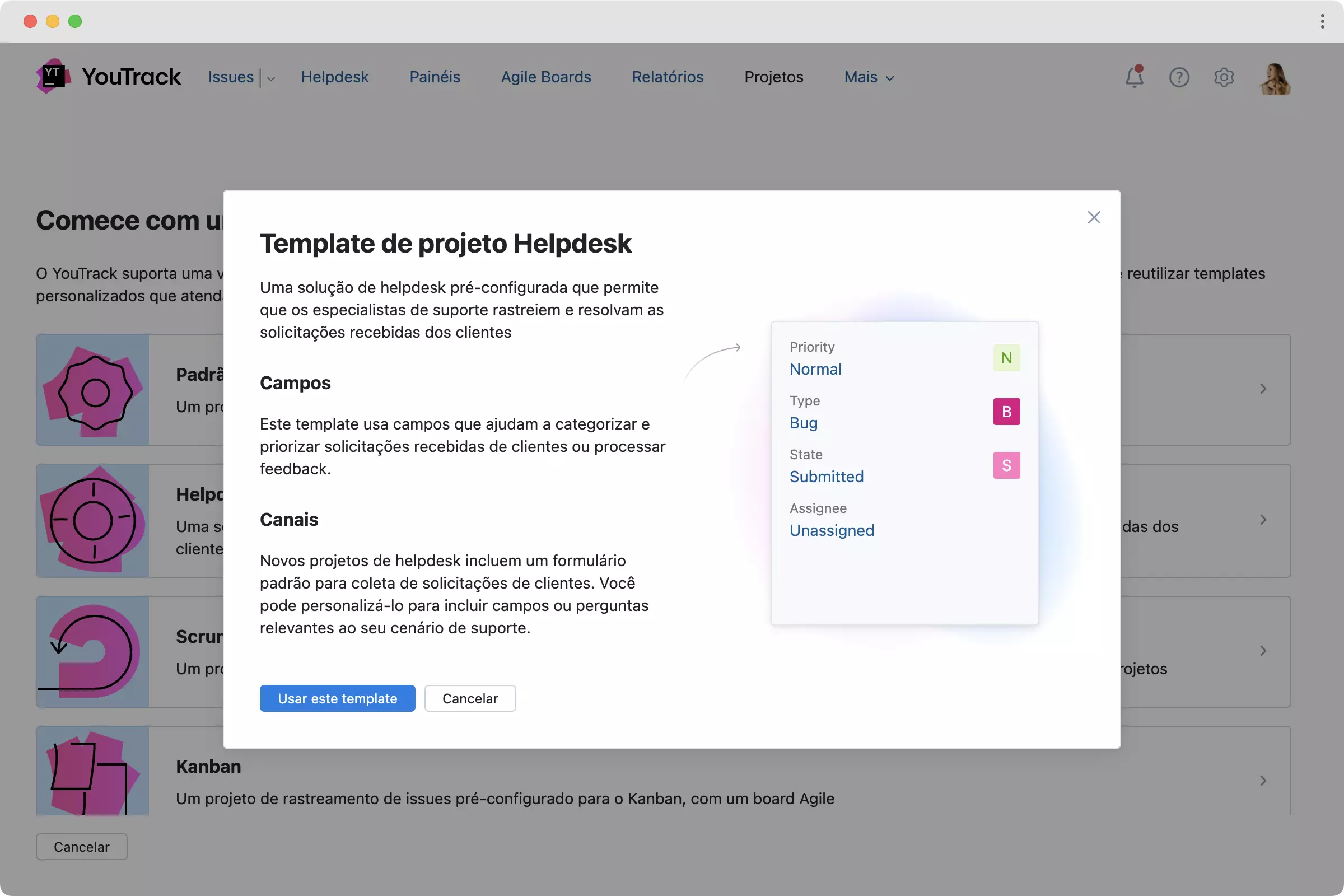 Atualizamos o assistente de projeto do YouTrack para ajudar os gerentes a navegarem mais facilmente pelo processo de criação de projetos. Você pode escolher entre modelos, passar por todas as etapas para personalizar os seus projetos e tarefas conforme as necessidades da sua equipe, convidar membros da equipe e muito mais.