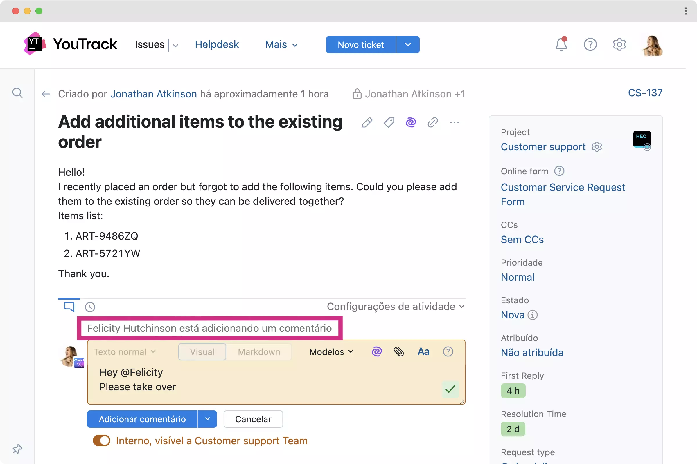 Agora os agentes de suporte e os membros da sua equipe podem ver quando outros agentes ou membros da equipe estiverem adicionando um comentário a um ticket. Isso ajuda a evitar a duplicação de esforços.