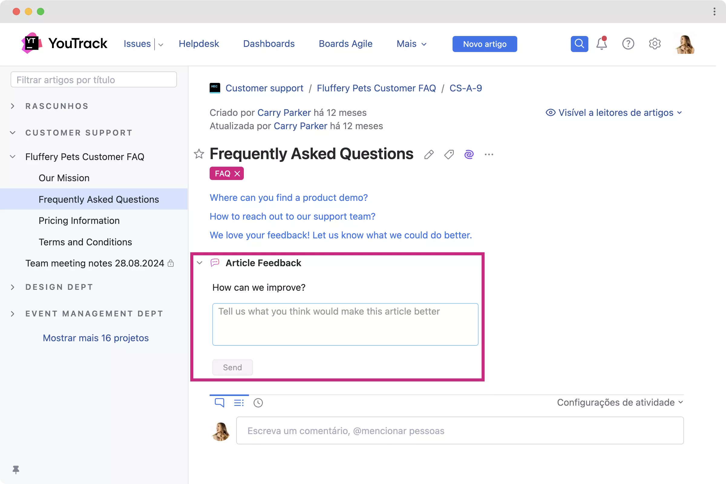O aplicativo coleta feedback sobre artigos publicados na Base de Conhecimento.