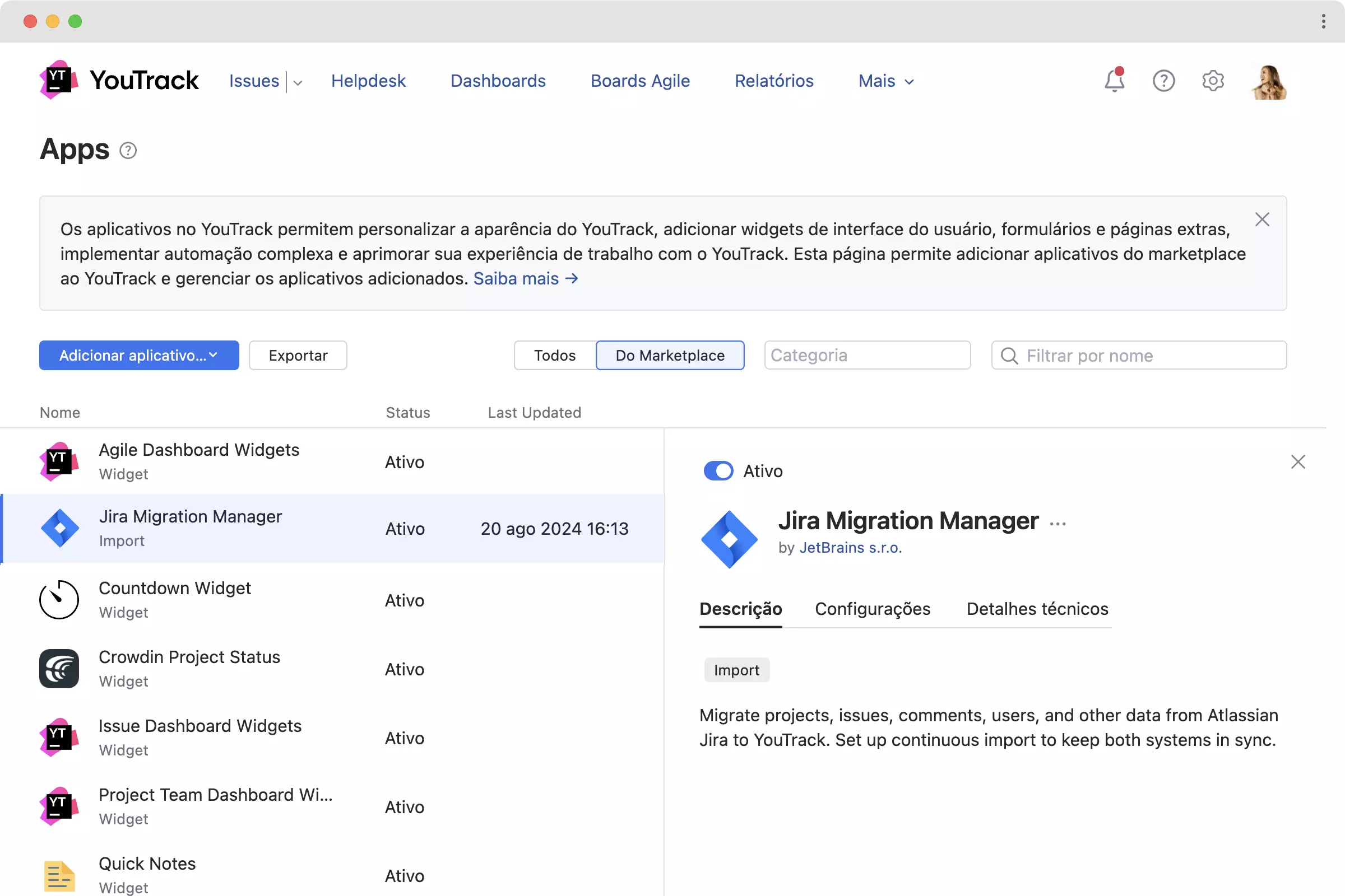 Você encontrará vários aplicativos pré-instalados no YouTrack que importam conteúdo de outros sistemas e adicionam alguns workflows e widgets populares aos seus dashboards.