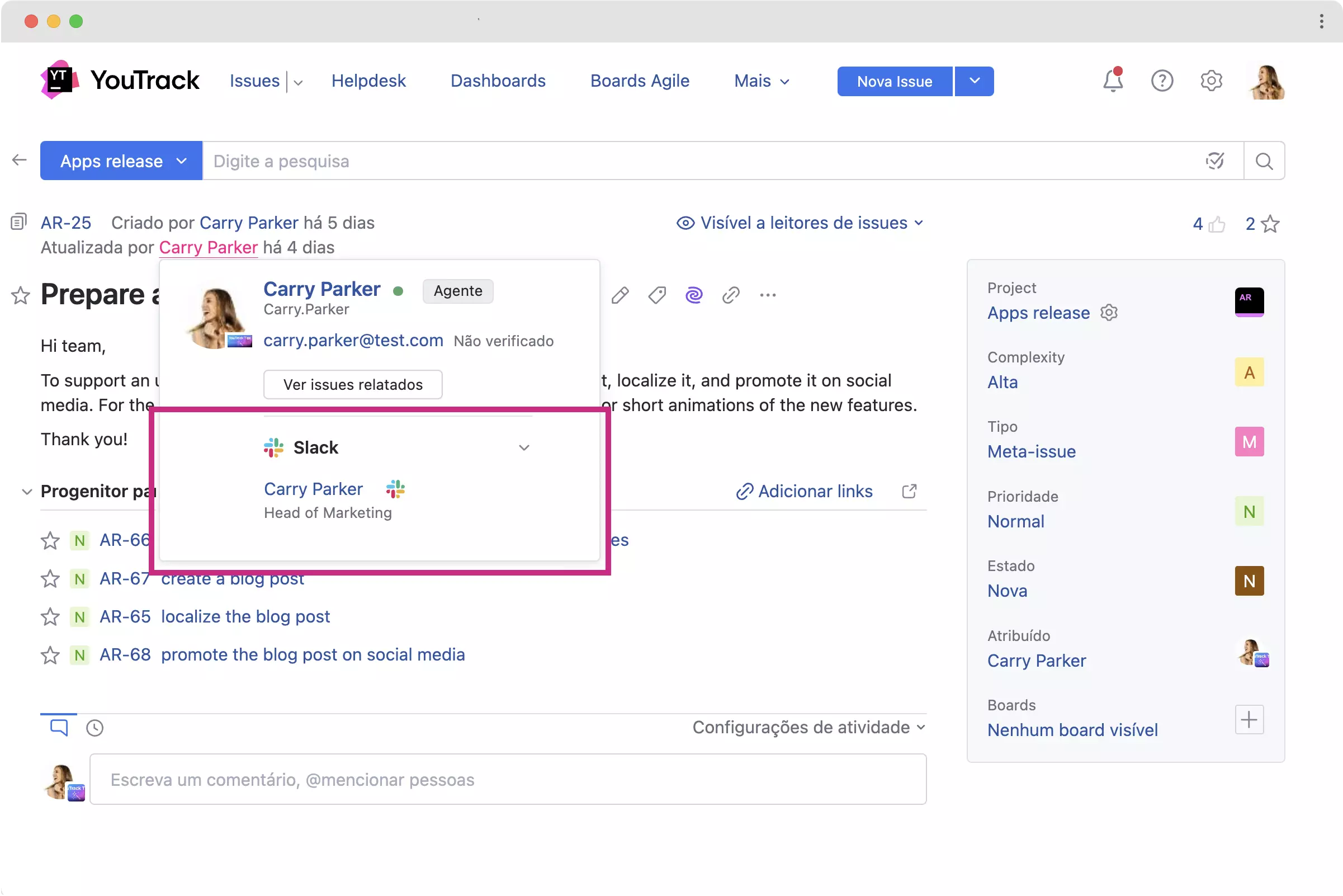 Esse aplicativo adiciona informações e status de perfis do Slack aos cartões de usuários do YouTrack.