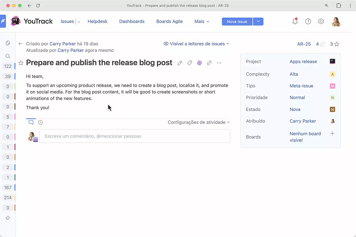 Com essa versão, você pode criar seus próprios aplicativos ou instalar aplicativos externos para oferecer suporte ao workflow da sua equipe. Os aplicativos do YouTrack permitem que você personalize sua aparência, adicione widgets de interface do usuário, formulários e páginas extras, implemente automação complexa com workflows e aprimore sua experiência de trabalho.