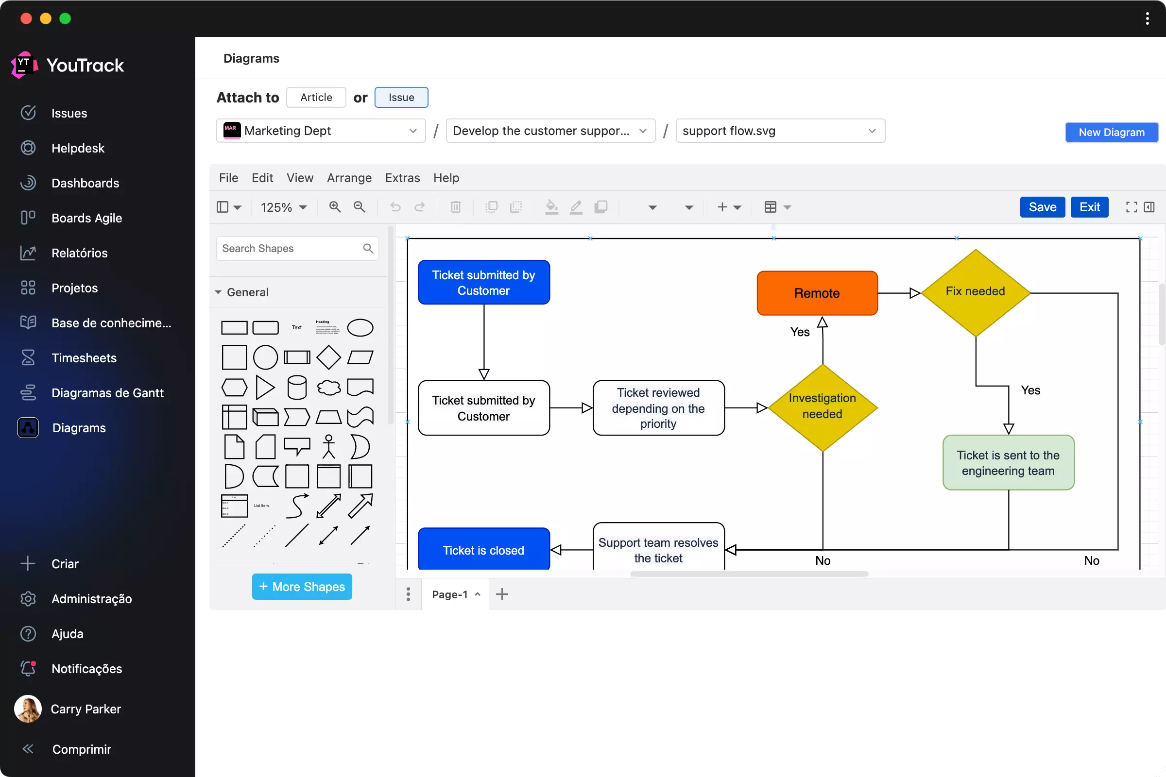 Aplicativos permitem que você expanda a funcionalidade do YouTrack, inclusive criando mais páginas totalmente novas. Essas páginas também podem ser adicionadas ao menu principal do YouTrack. Por exemplo, o Diagram Editor permite que as equipes criem diagramas em uma página especial, que também está disponível no novo painel esquerdo.
