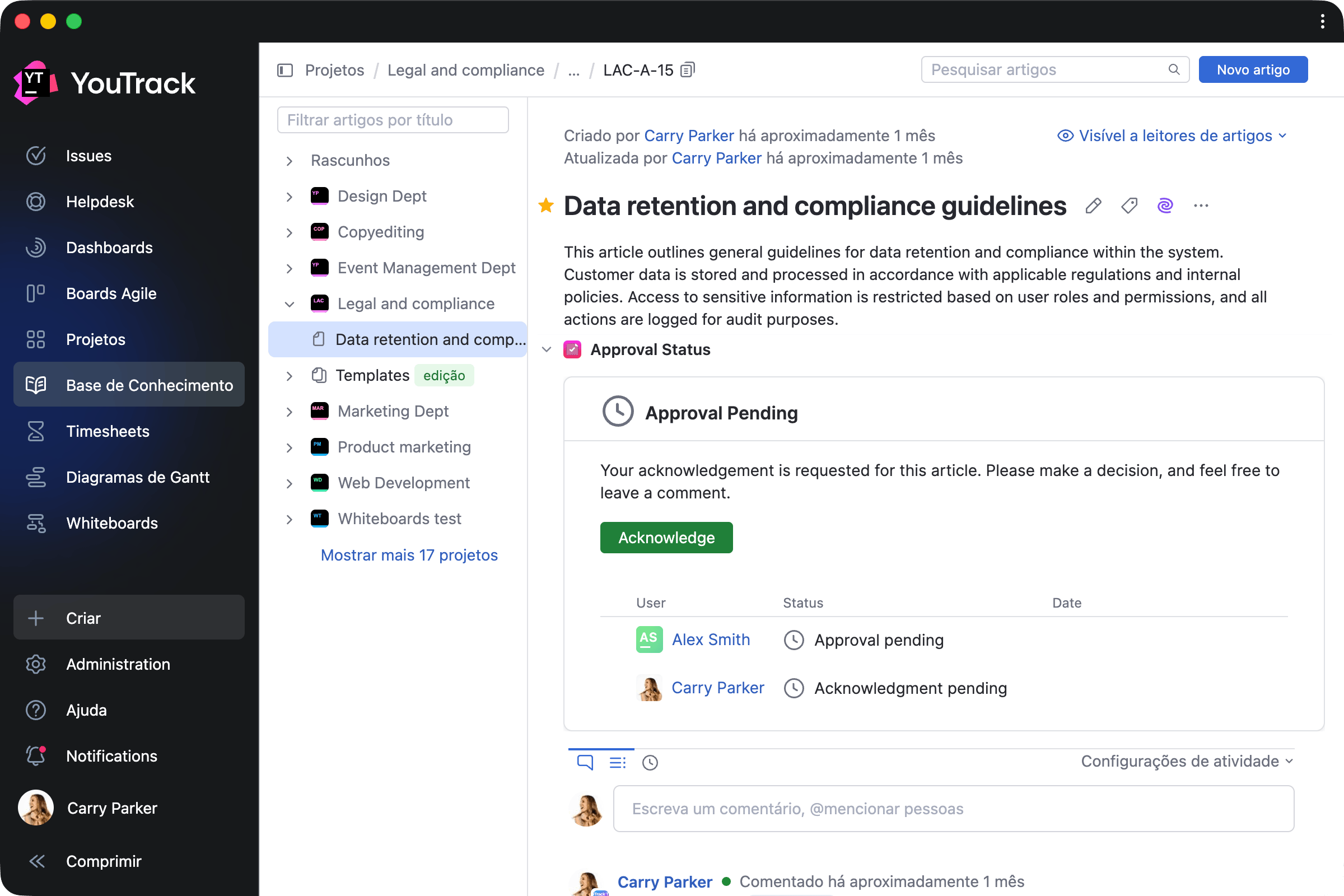 Este aplicativo pago permite que as equipes gerenciem fluxos de trabalho de aprovação diretamente na base de conhecimentos. Você pode convidar pessoas para aprovar e tomar ciência de cada artigo, estabelecer prazos e acompanhar o status das aprovações.