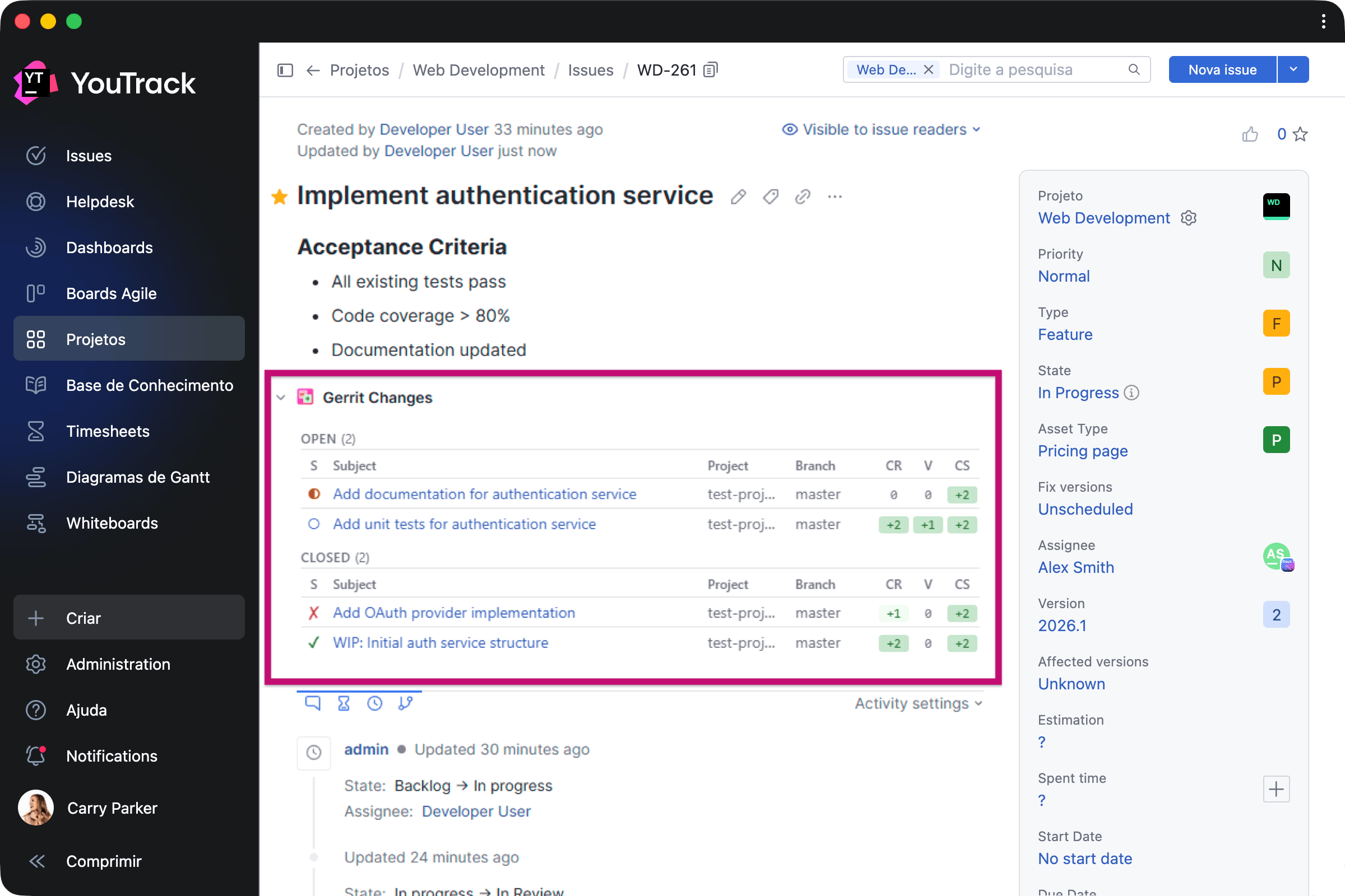 Este aplicativo permite aos desenvolvedores exibirem alterações relacionadas do Gerrit Code Review diretamente em tarefas, incluindo o status, as aprovações e os links.
