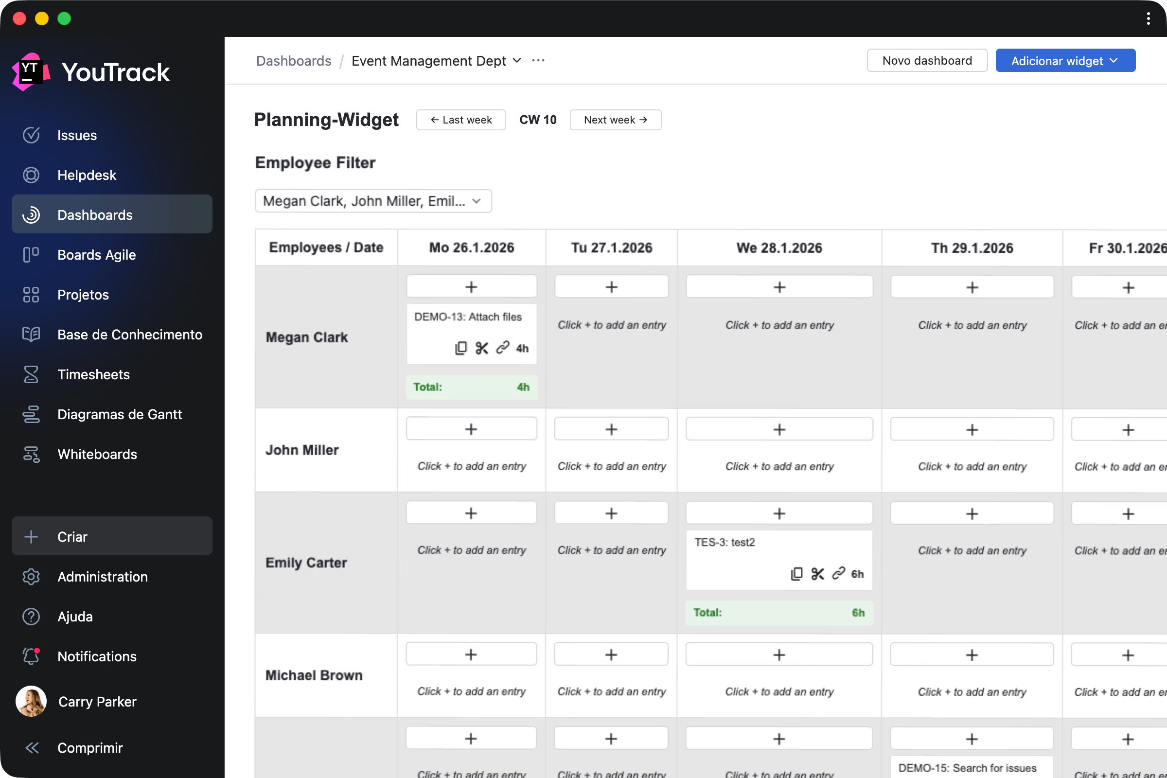 Este aplicativo ajuda os gerentes a planejarem as atividades da equipe em uma visualização de agenda. Revise as tarefas e os tickets nos quais os membros da equipe trabalham a cada dia, acompanhe o tempo gasto e filtre a visualização por funcionário.