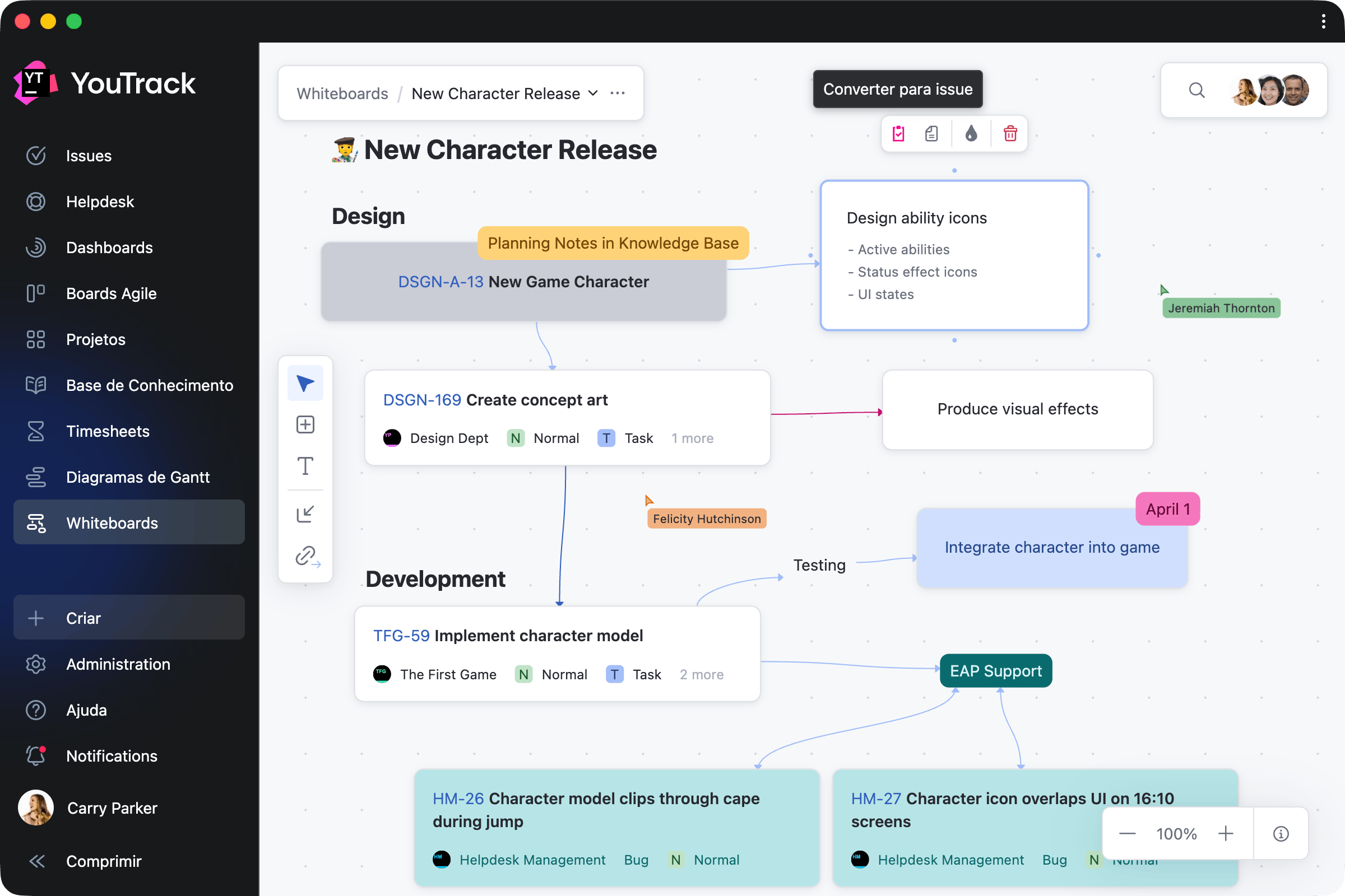 Os whiteboards são um novo espaço flexível para as equipes planejarem, fazerem brainstorms e colaborarem com eficácia. Conecte os seus projetos atuais para ter uma melhor visão geral e organizar o seu trabalho ou, quando estiver pronto, adicione anotações e transforme-as em tarefas e artigos. Isso permite aos gerentes de projeto e às equipes planejarem do zero, colaborarem em projetos em andamento e garantirem que cada atividade esteja associada ao seu trabalho no YouTrack.