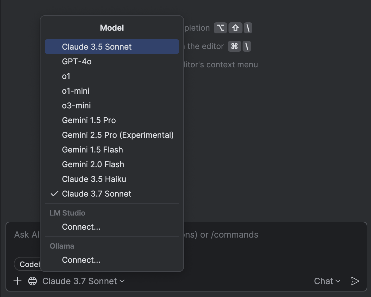 Принцип BYOK (Bring your own key — «Принеси свой ключ») позволяет использовать собственные ключи API для OpenAI, Anthropic или любой локальной модели, совместимой с API OpenAI, так что вы можете более гибко управлять использованием ИИ в JetBrains IDE. Вы сможете использовать выбранный чат с ИИ и агентов, даже не входя в JetBrains AI. Это отличный вариант для разработчиков, у которых уже есть ключи API, и они хотят работать с привычным сервисом. Ожидается, что функция будет развернута в одном из предстоящих релизов 2025.3.x.
