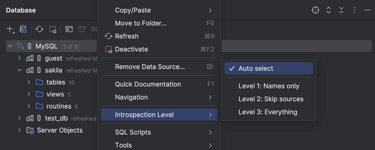 Вся работа с базами данных в PyCharm основана на движке DataGrip. Подробнее об этих функциях — в примечаниях к релизу DataGrip 2025.3.