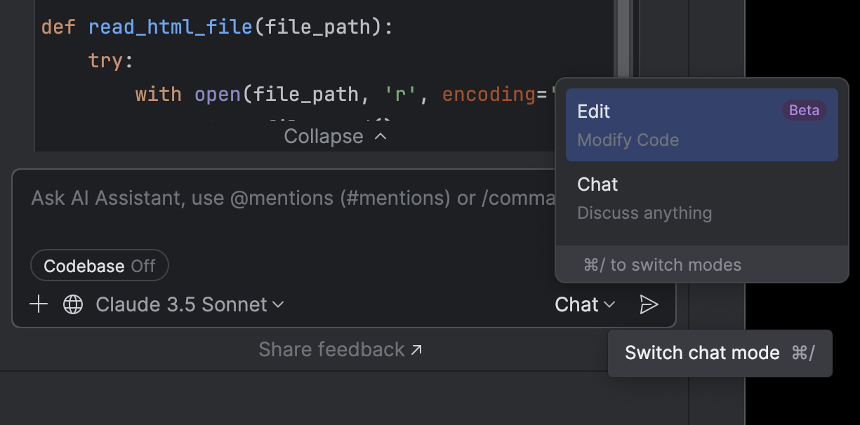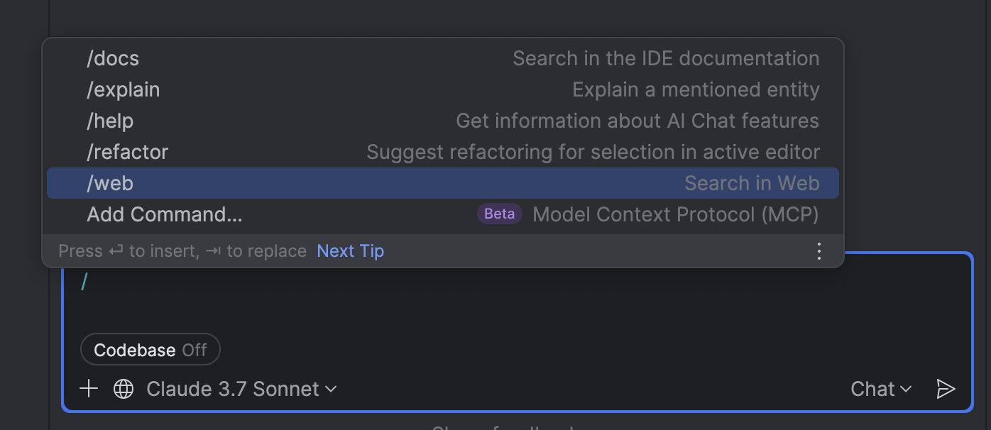 Самый простой способ начать работу с любым агентом в этой версии — запустить его прямо из чата с ИИ. Однако плагин Junie также будет доступен, если вы предпочитаете такой способ взаимодействия с этим ассистентом. Некоторые возможности (например, предупреждения о дорогостоящих задачах) доступны только через плагин, но самые распространенные функции встроены в чат с ИИ.