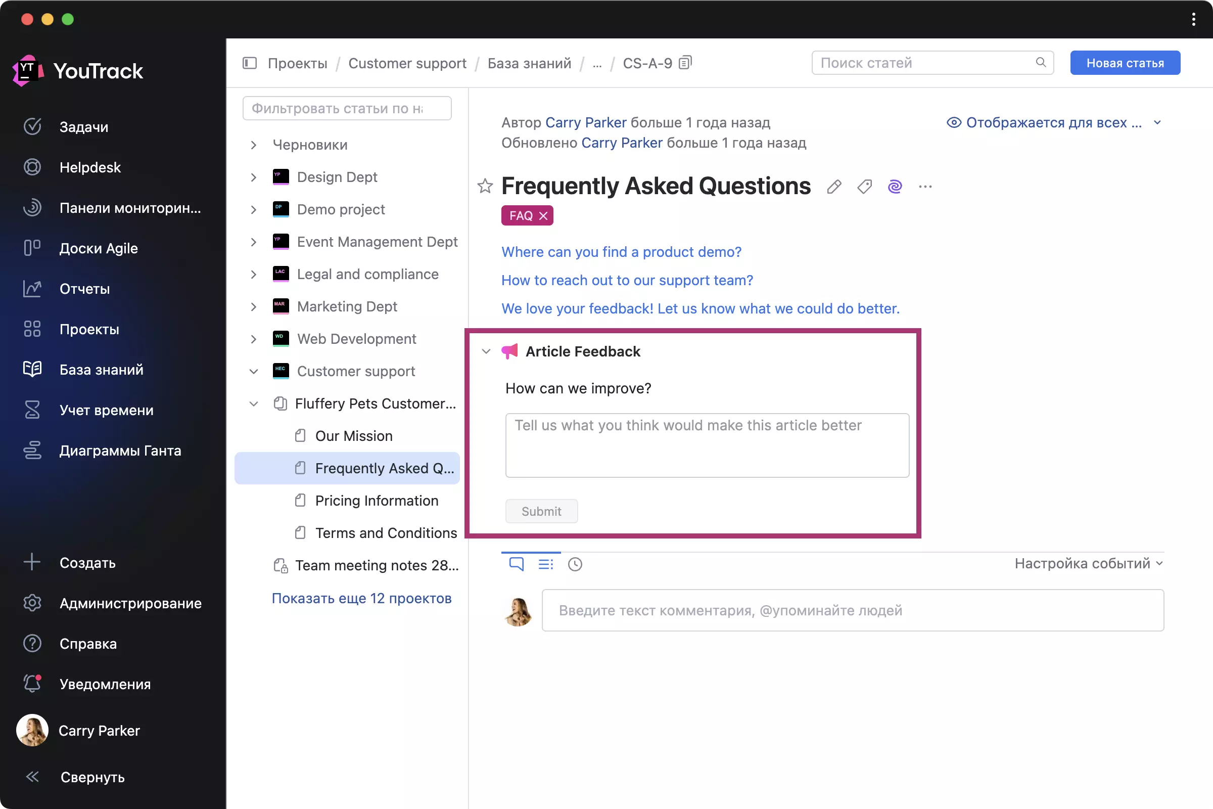 Собирает отзывы на статьи, опубликованные в базе знаний.