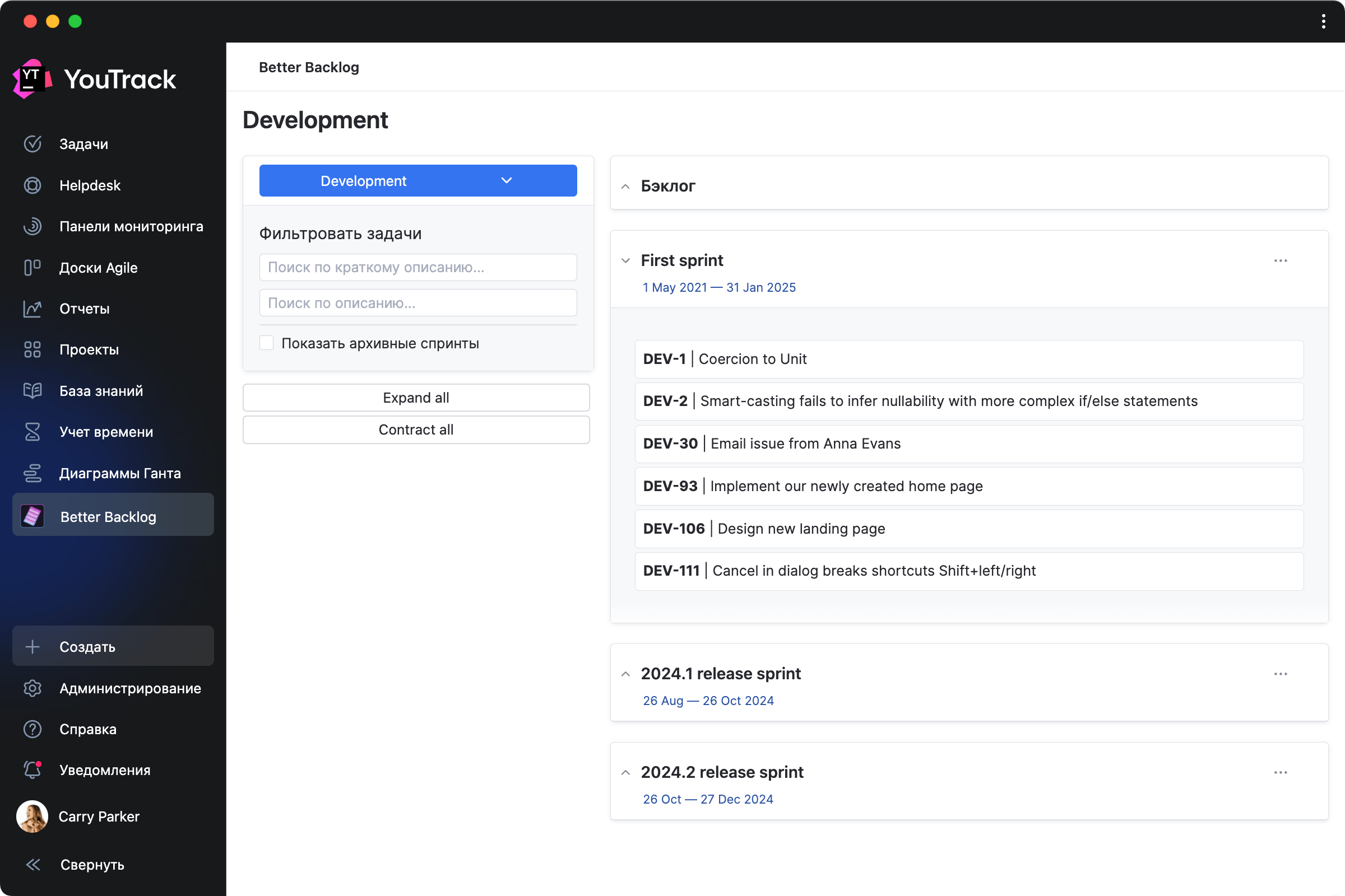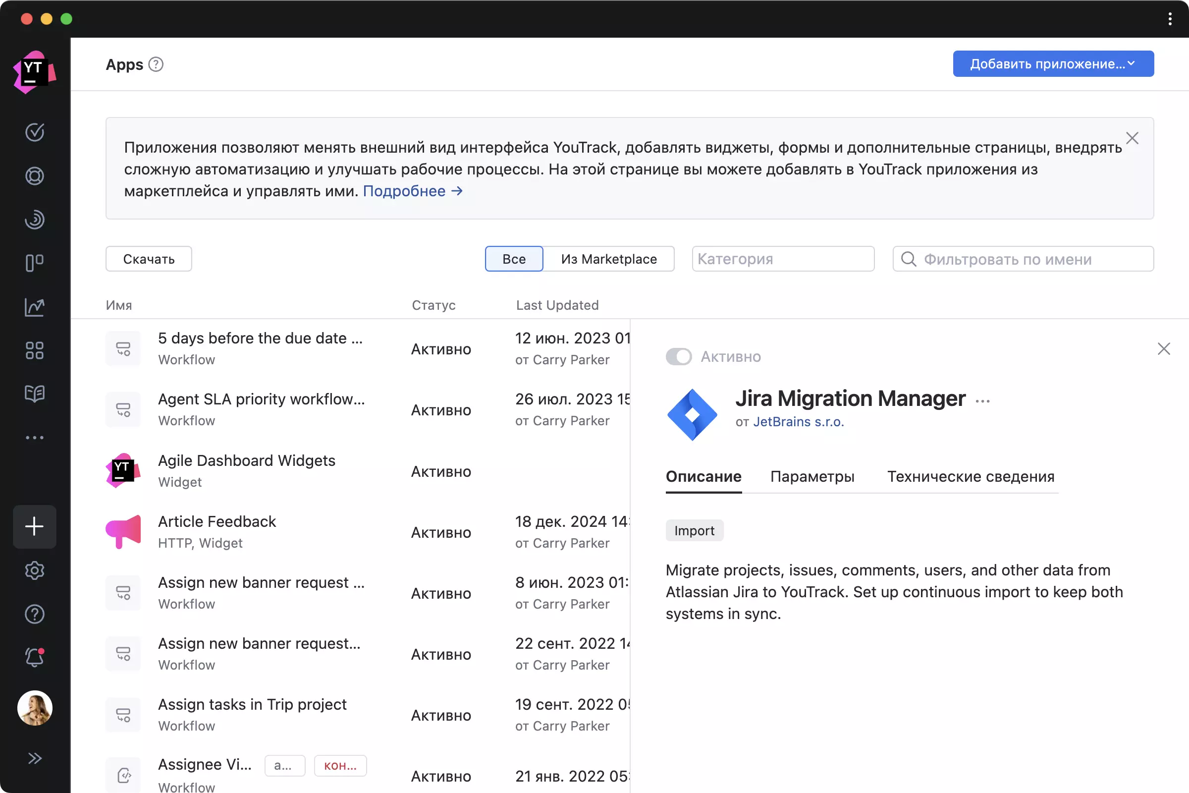 Приложения помогают настроить YouTrack под ваши потребности: можно добавлять интеграции, виджеты с данными и рабочие процессы. Это простой способ расширить возможности системы. Создайте свое приложение, обратитесь за помощью к нашим консультантам или найдите готовое решение на JetBrains Marketplace.